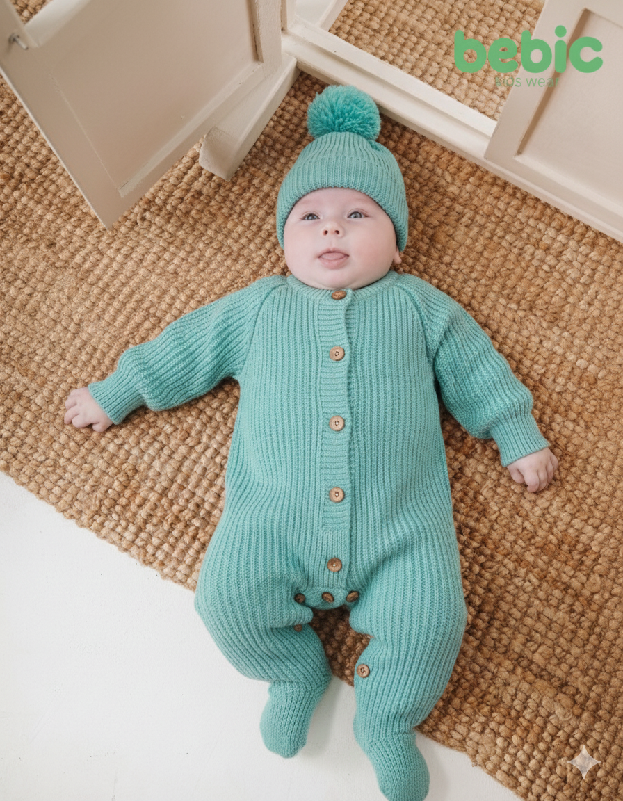 طقم شتوي أنيق ودافئ للأطفال، مصنوع من قماش محبوك مضلع بلون فيروزي نابض بالحياة. يتضمن الطقم قطعة واحدة (أو كارديجان وبنطال متناسقين) بأزرار خشبية طبيعية. قبعة شتوية متناسقة مزينة بكرة صوفية كبيرة تُكمل الإطلالة. يضمن هذا الطقم دفئًا مثاليًا ومظهرًا أنيقًا لطفلك.