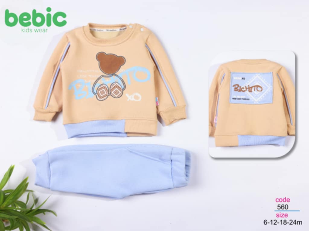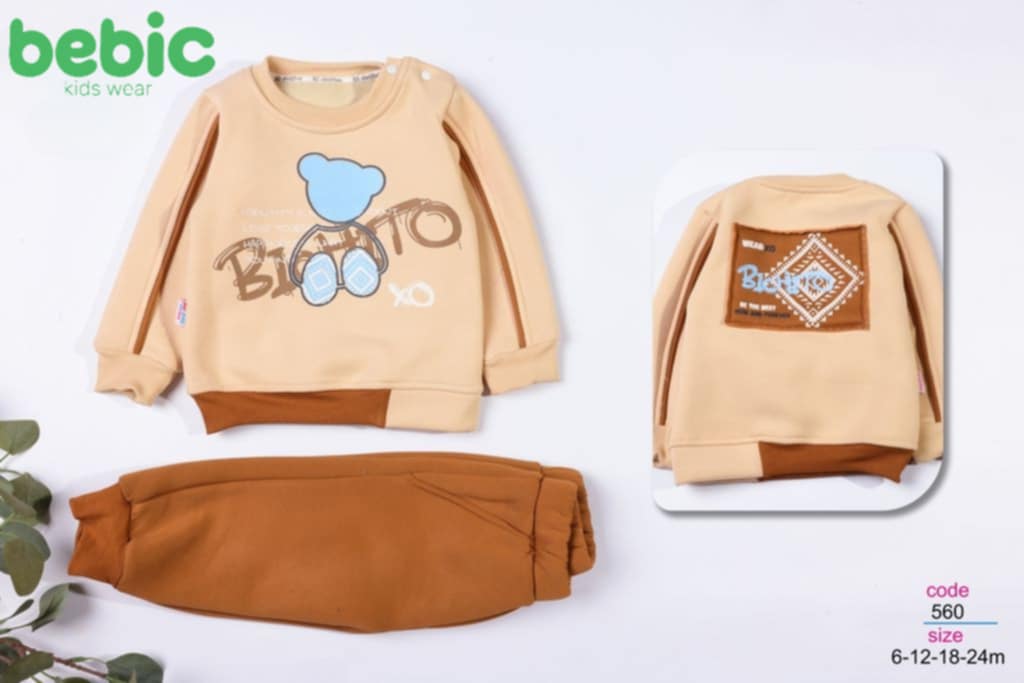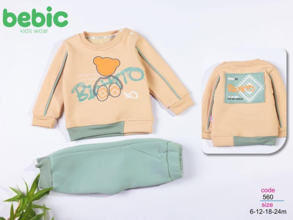 This boys' two-piece set includes a sweatshirt and warm cotton pants. The sweatshirt is light beige with a cute orange teddy bear graphic and mint green accents, while the pants are in the same green color for a comfortable and modern look. The design features side zippers and a printed back pattern that adds a distinctive touch. Suitable for fall and winter, it's perfect for everyday outings or playtime.