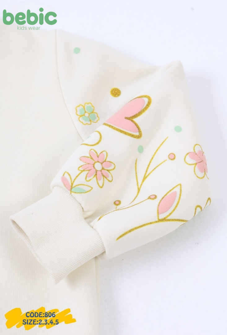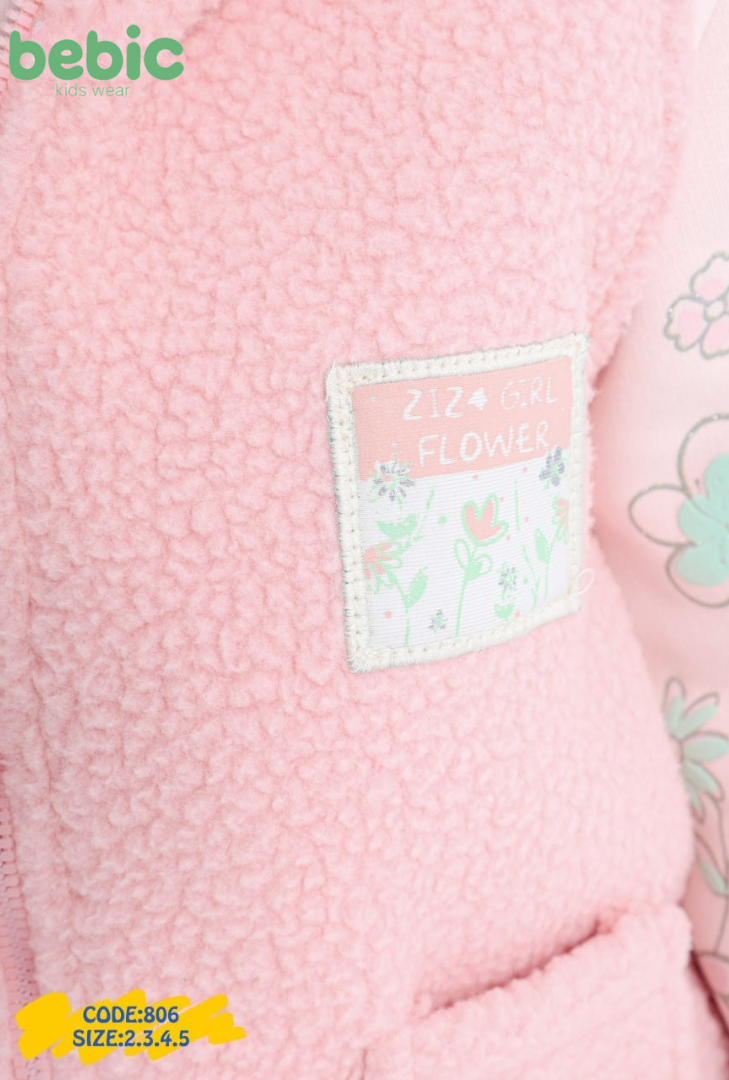A sleeveless sweatshirt with a floral and botanical print. A hooded, zip-front vest made of warm, lightweight boucle/faux-fur fabric with square pockets. The set is completed with comfortable, solid-colored joggers featuring a simple print. Available in muted color combinations such as beige and pink, or pink and gray.