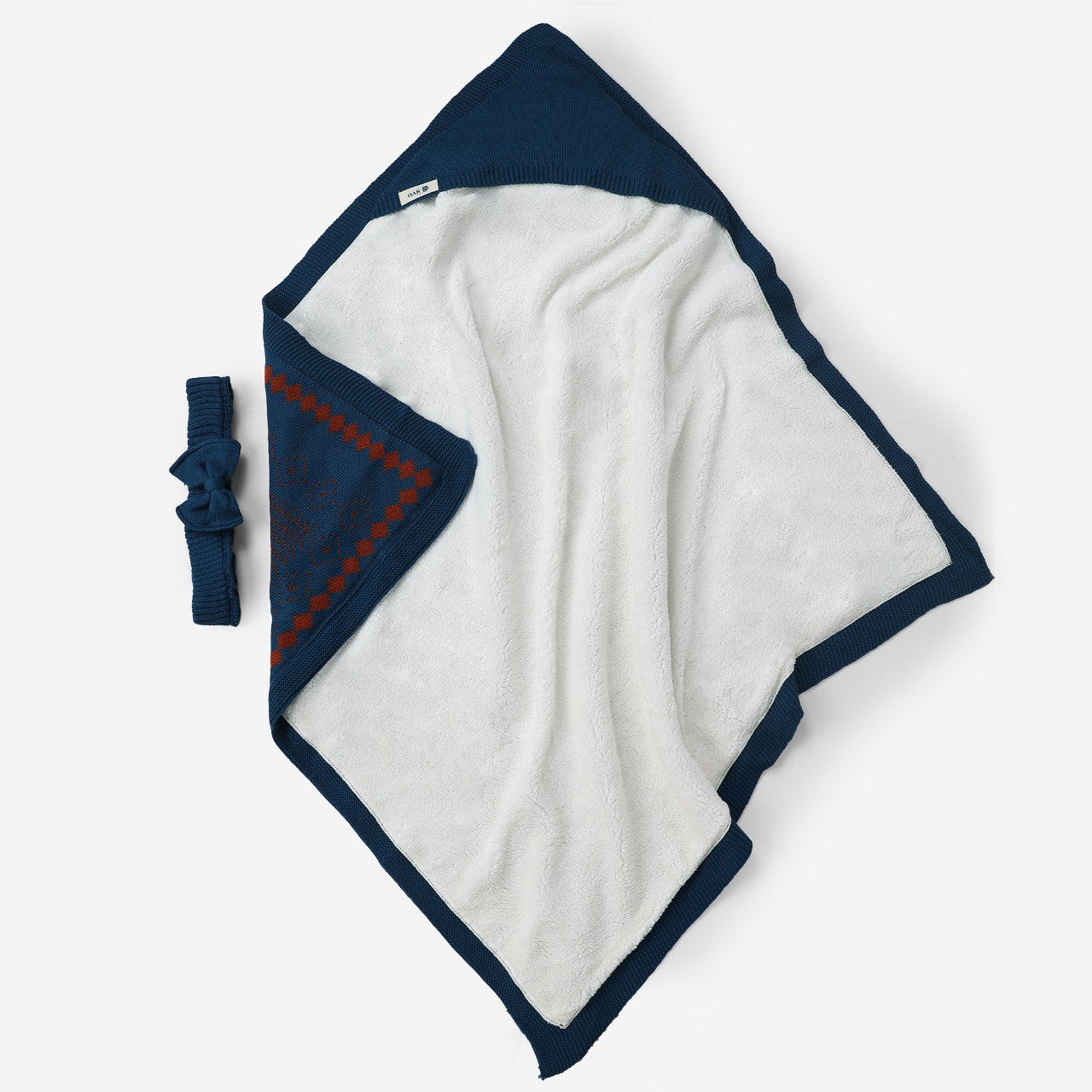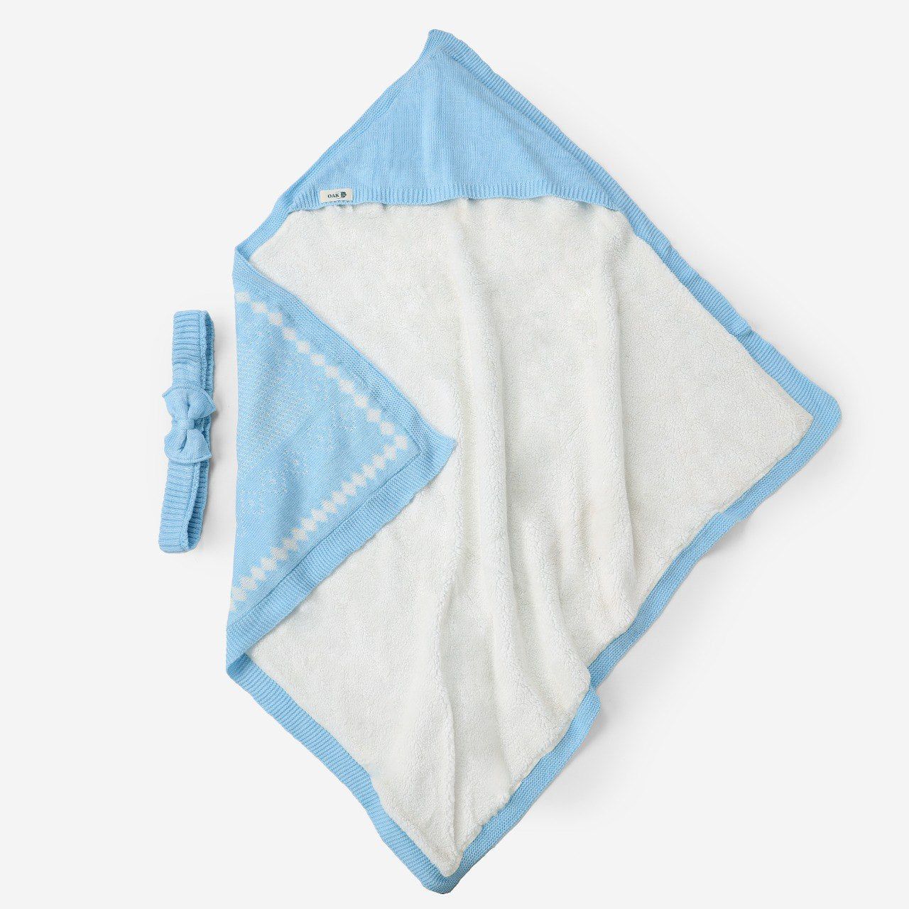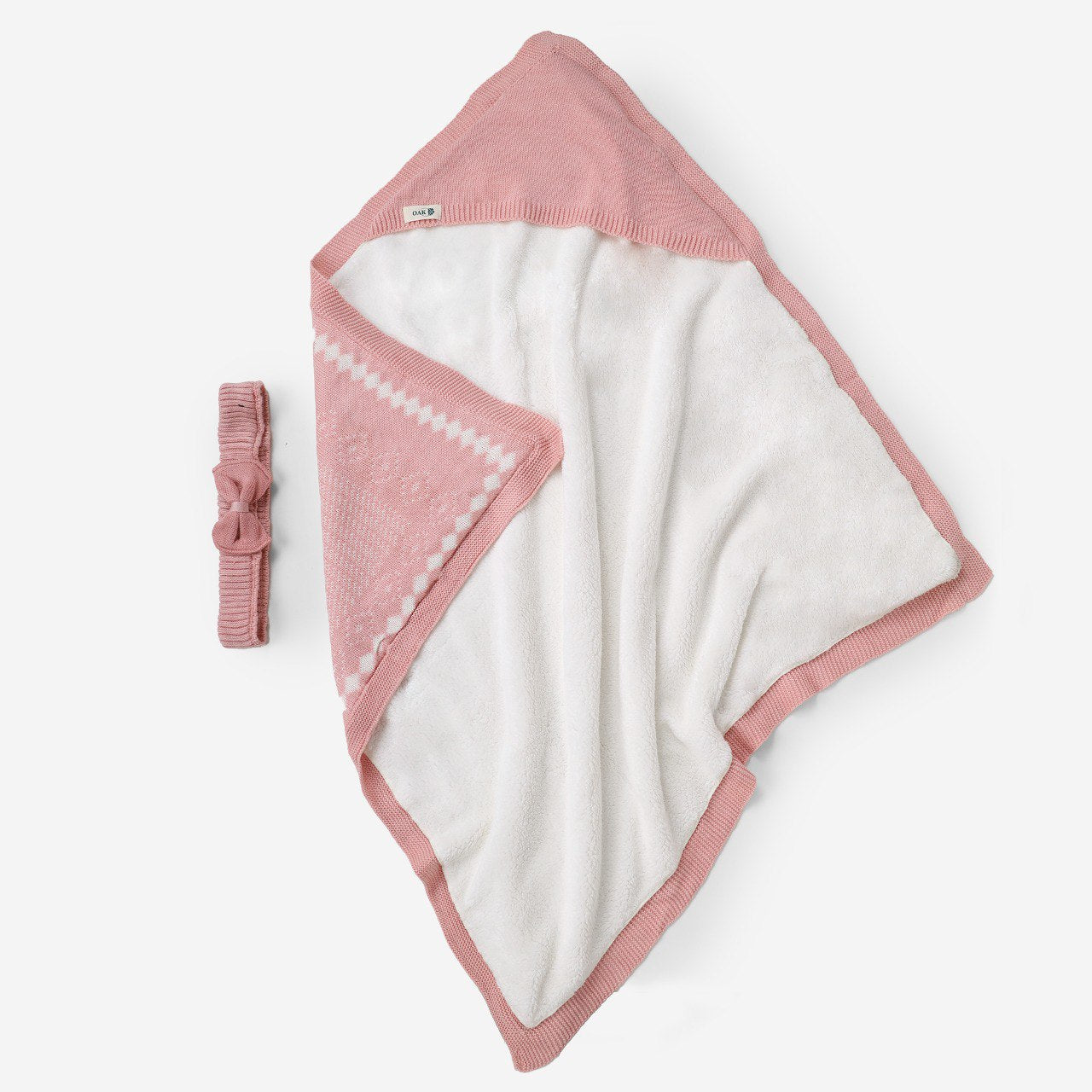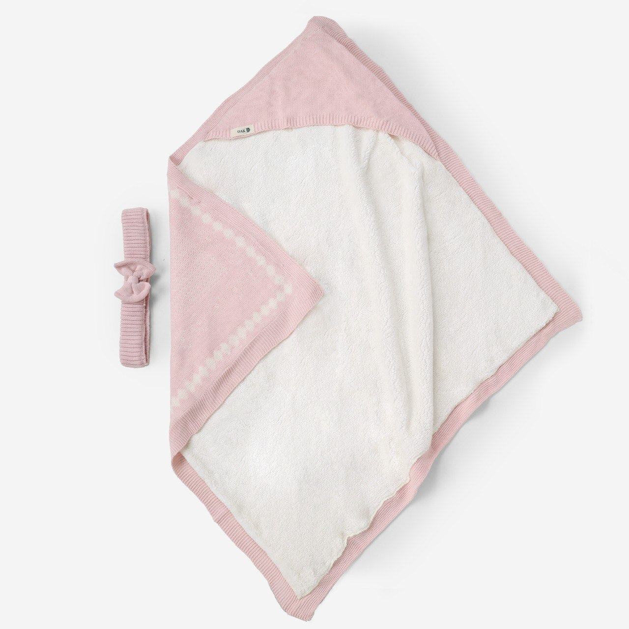 This luxurious quilted knit blanket for babies comes in a variety of colors and features raised, geometric knit details. The outer layer is soft and textured knit, while the inner layer is a super-soft white fleece (terry/sherpa) lining that provides exceptional warmth and comfort. It has a square design with a built-in triangular hood and is trimmed with pink ribbed edges. Use it to wrap and keep your baby warm after a bath or during sleep. A matching pink knit headband with a decorative bow is included.
