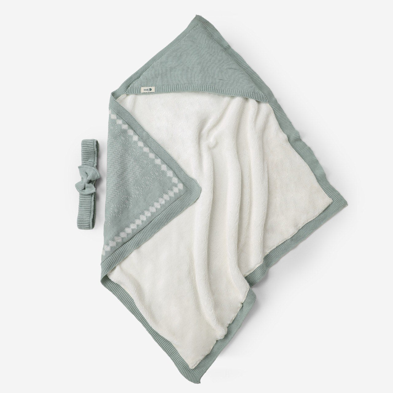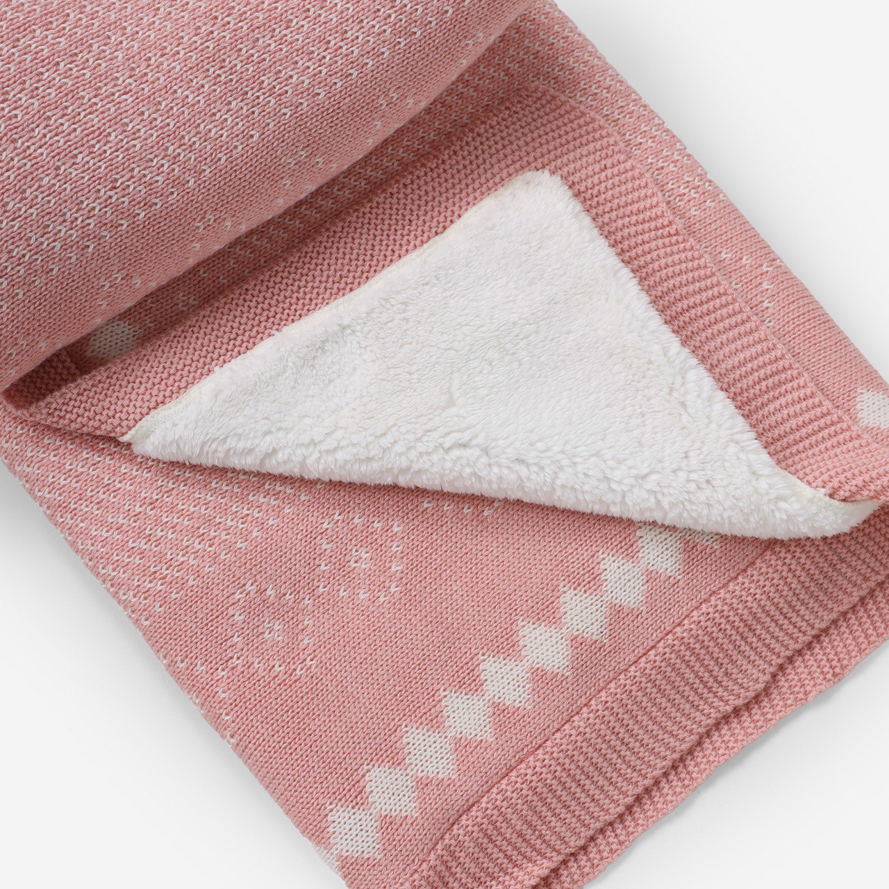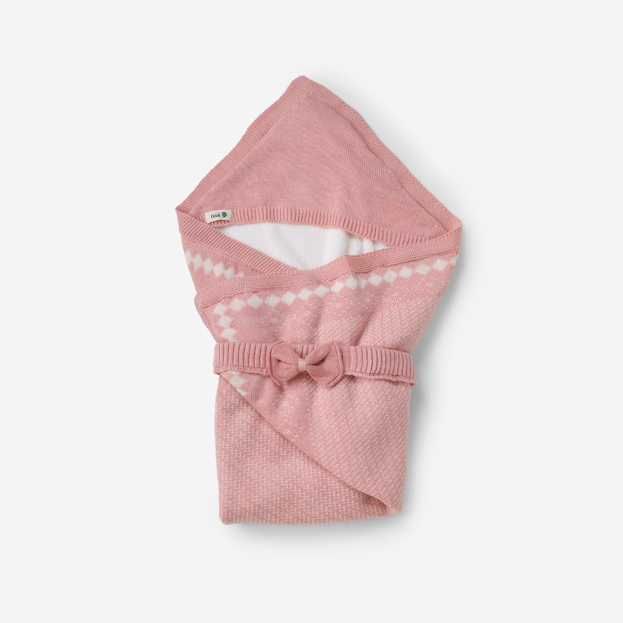 This luxurious quilted knit blanket for babies comes in a variety of colors and features raised, geometric knit details. The outer layer is soft and textured knit, while the inner layer is a super-soft white fleece (terry/sherpa) lining that provides exceptional warmth and comfort. It has a square design with a built-in triangular hood and is trimmed with pink ribbed edges. Use it to wrap and keep your baby warm after a bath or during sleep. A matching pink knit headband with a decorative bow is included.