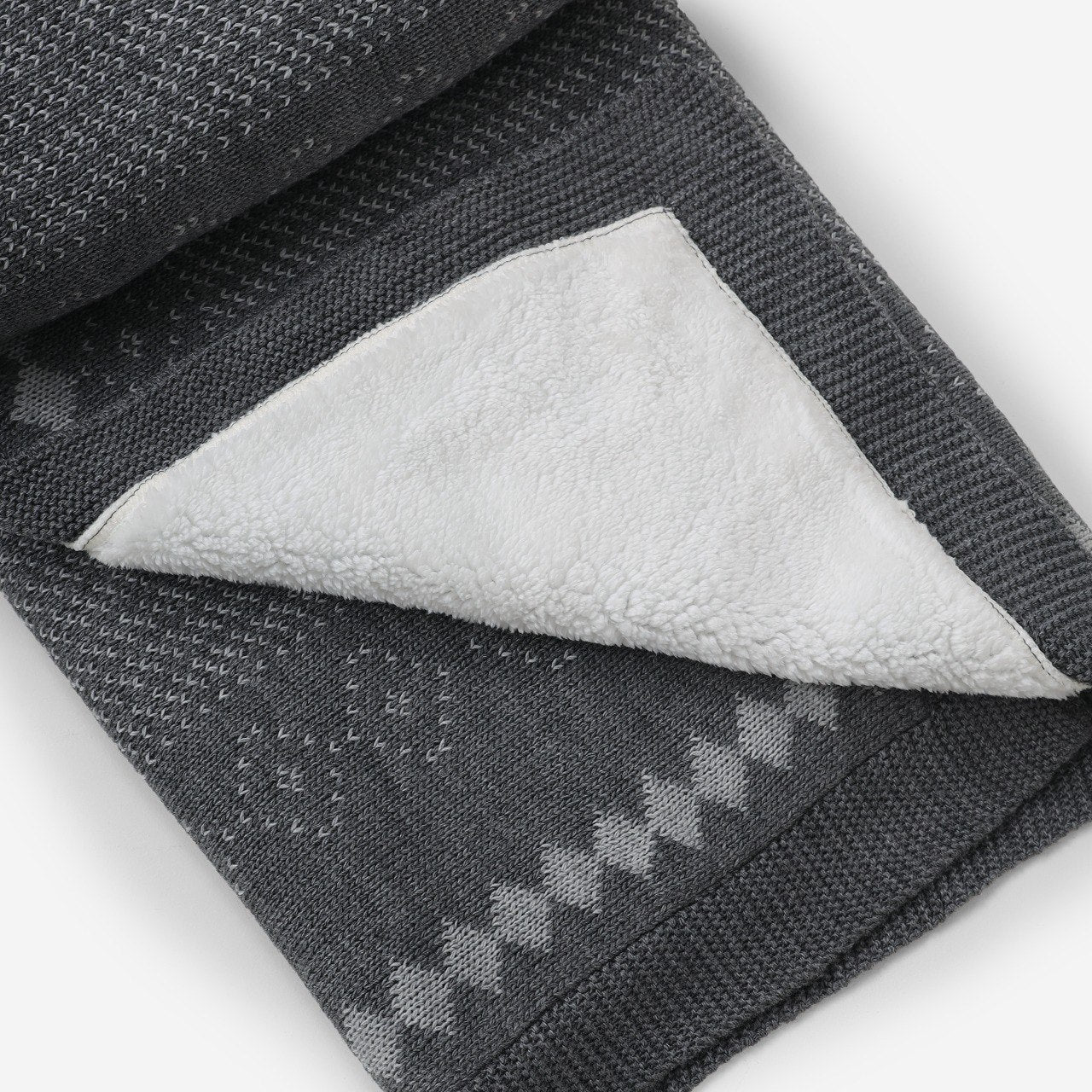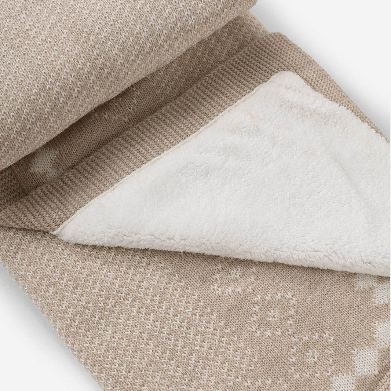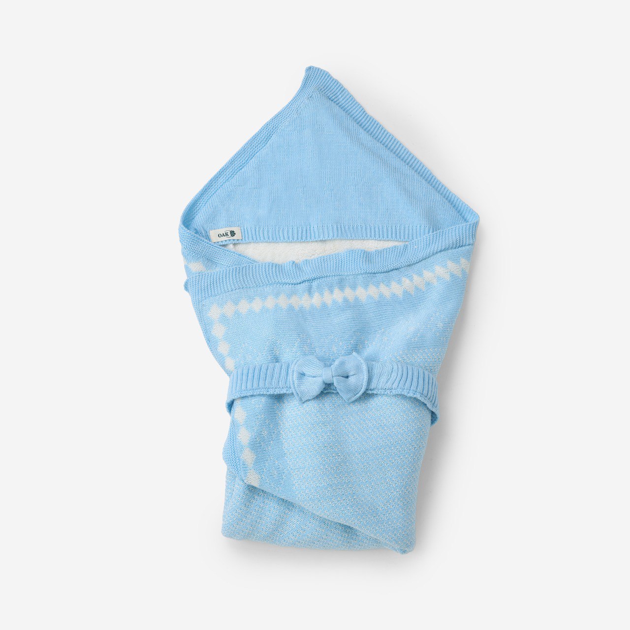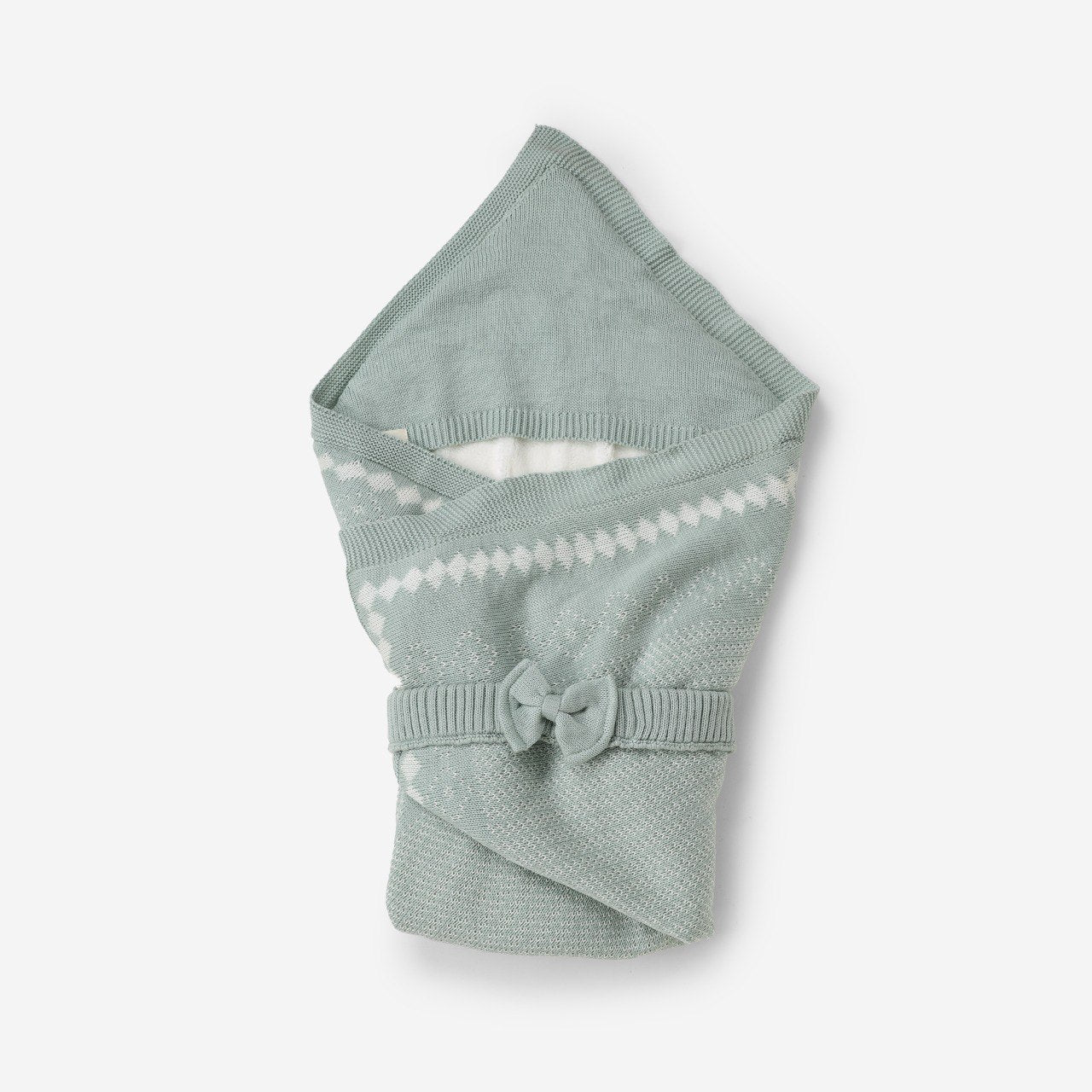 This luxurious quilted knit blanket for babies comes in a variety of colors and features raised, geometric knit details. The outer layer is soft and textured knit, while the inner layer is a super-soft white fleece (terry/sherpa) lining that provides exceptional warmth and comfort. It has a square design with a built-in triangular hood and is trimmed with pink ribbed edges. Use it to wrap and keep your baby warm after a bath or during sleep. A matching pink knit headband with a decorative bow is included.
