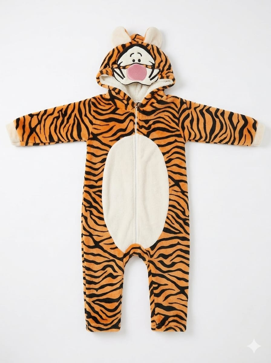 This fun winter romper for kids is inspired by the popular tiger character and features a classic orange and black striped pattern with a white belly area. Made from soft, warm fleece, it provides ultimate comfort and warmth in cold weather. The romper includes a hood with a tiger face and delicate embroidered details, including ears, adding a cute and charming cartoon touch. It also has a convenient front zipper for easy dressing and undressing, making it a practical and comfortable choice for everyday wear or a thoughtful gift.