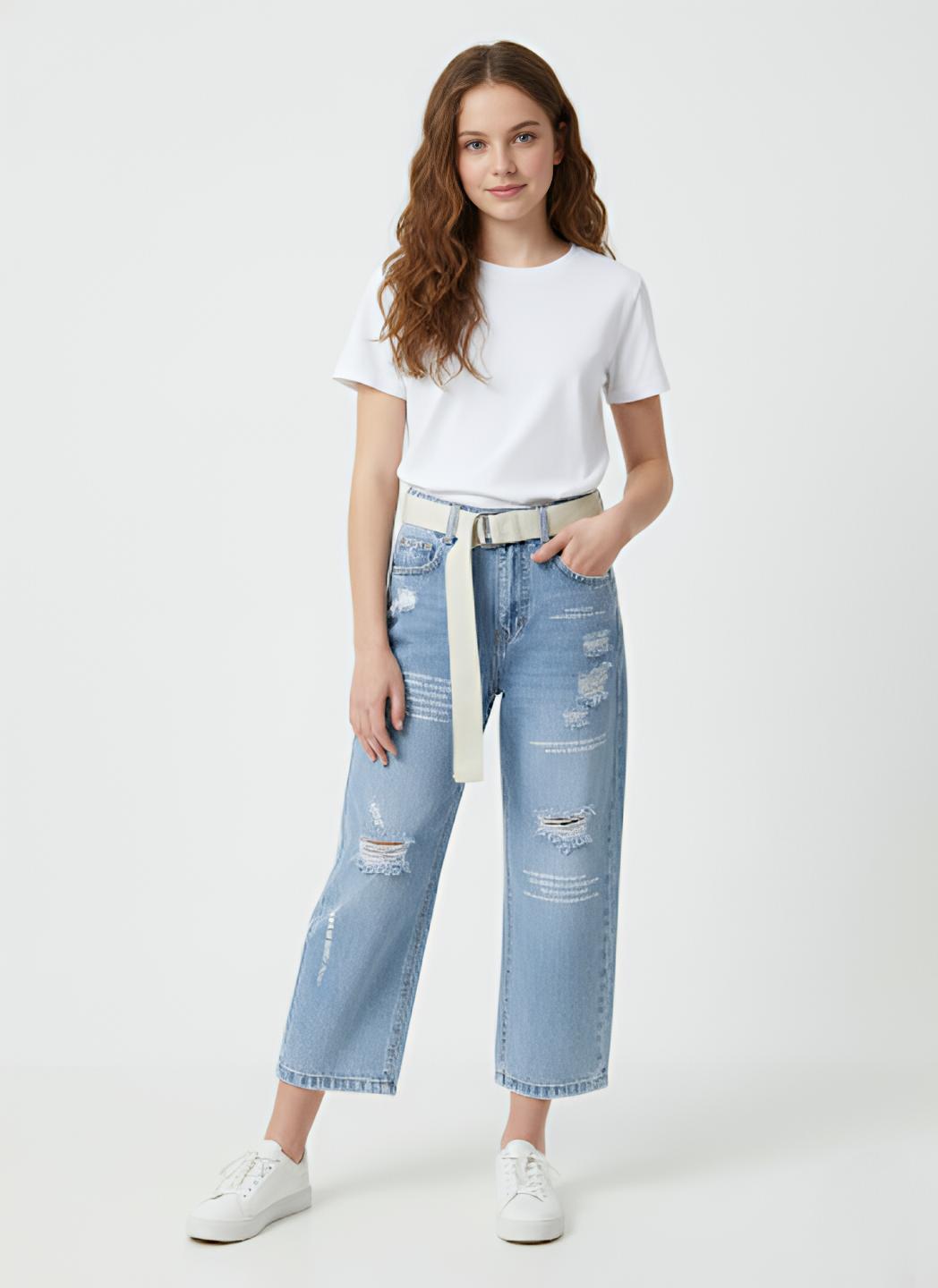 يتميز هذا البنطال ذو الأرجل الواسعة بتصميم عصري يجمع بين الراحة الفائقة والأناقة الجريئة. مصنوع من قماش الدنيم الأزرق الفاتح عالي الجودة، مما يمنحه مظهرًا منعشًا وحيويًا. تضيف التفاصيل الممزقة الموزعة بعناية لمسة عصرية تجذب الأطفال، بينما يضمن القص الواسع حرية كاملة في الحركة. ينسدل حزام طويل من القماش الكريمي اللون بأناقة على الخصر، مضيفًا لمسة فريدة وأنيقة. تجمع هذه القطعة المثالية بين المتانة والأناقة العصرية الراقية، مما يجعلها الخيار الأمثل لإطلالة كاجوال مميزة ومريحة في آن واحد.
