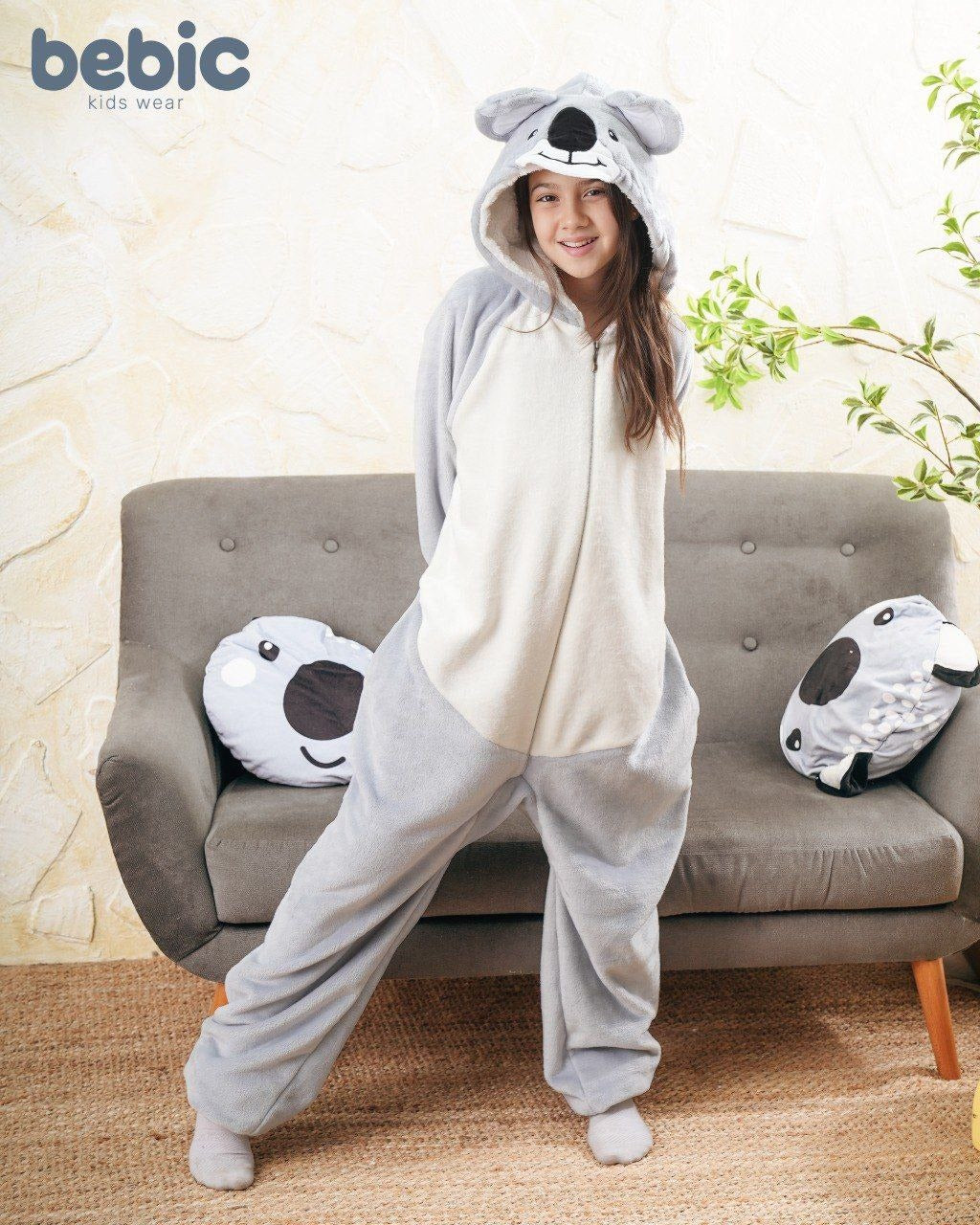 This is a complete one-piece Kigurumi costume featuring a cute koala design. Made from warm and soft light gray fleece polar fleece with a cream-colored belly area, it includes a koala-head hat with floppy ears. The loose-fitting and comfortable costume closes with a front zipper and is perfect for keeping warm in cold weather.