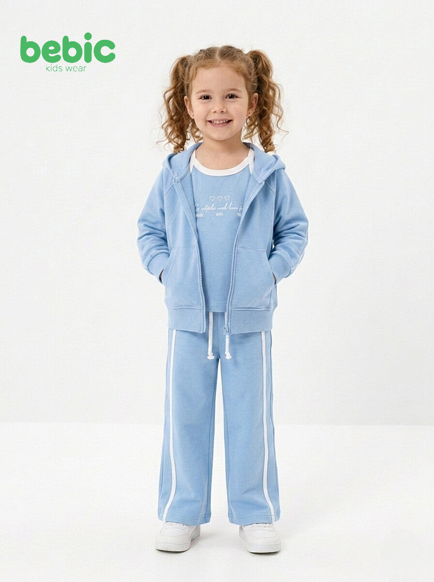 This outfit features a modern design that combines comfort and style, available in a calming light blue and a vibrant fuchsia to suit a variety of tastes. The set includes three harmonious pieces: a zip-up hoodie with spacious pockets and white stripes on the sleeves, paired with a soft cotton T-shirt featuring a white crew neck and delicate embroidered hearts and words in the center. The set is completed with comfortable wide-leg trousers that allow for freedom of movement, featuring an elasticated waistband with a white drawstring and white side stripes for a classic sporty touch. Made from high-quality cotton, this outfit is perfect for everyday activities or casual outings, offering a complete and attractive look.