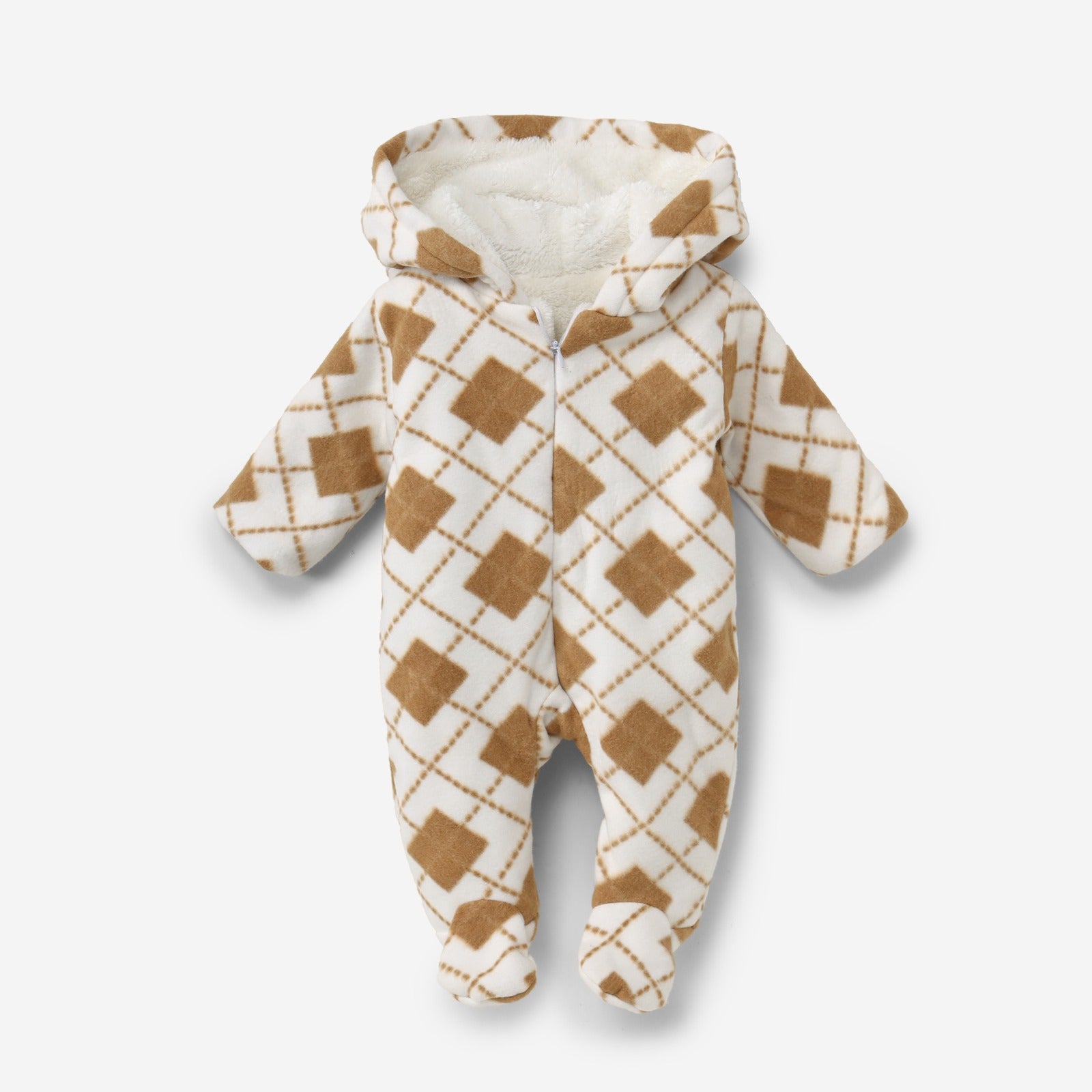 A warm, footed winter romper for infants. It features a classic white argyle pattern with light brown/caramel cross-checks.