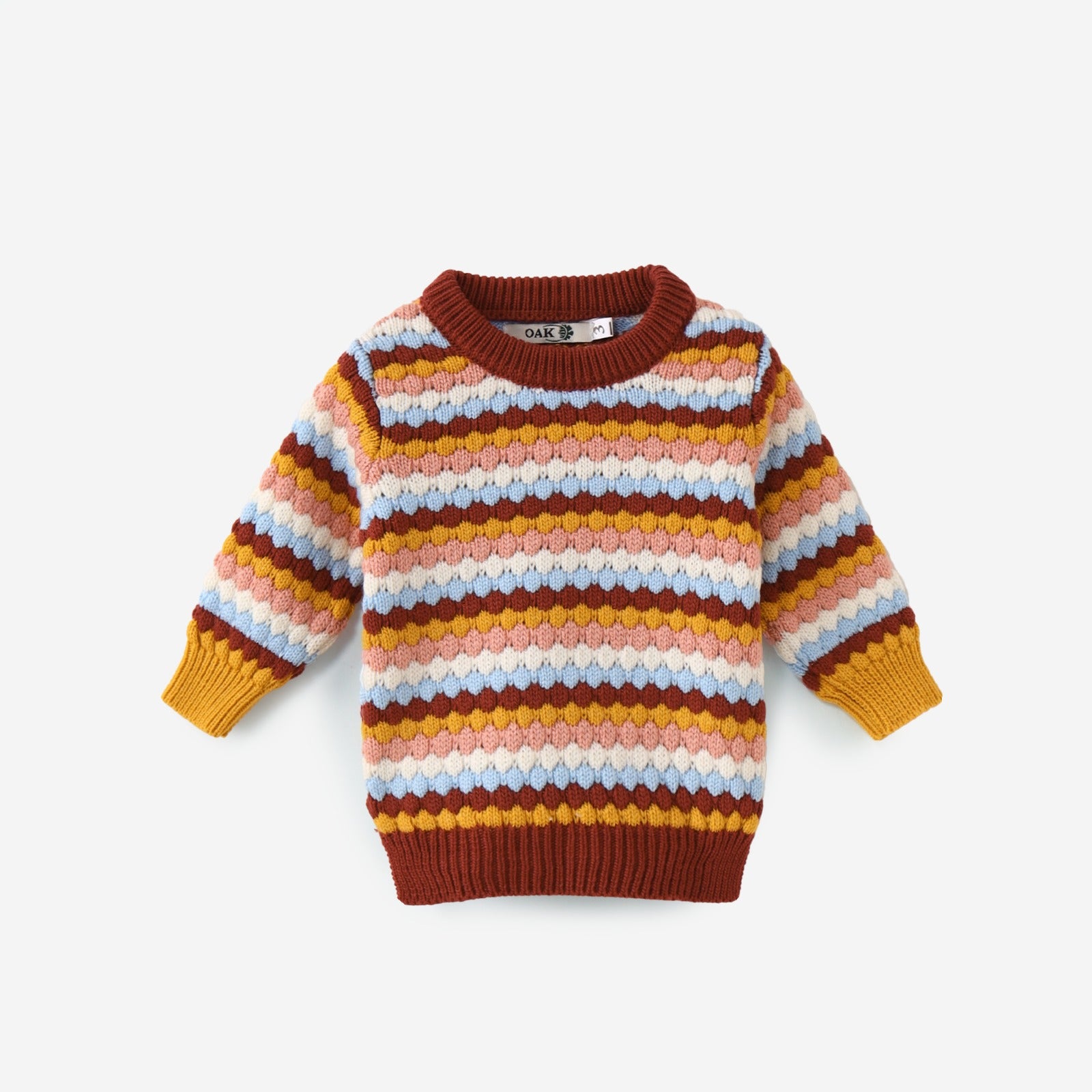 This children's winter wool sweater features a horizontal stripe design in warm, earthy tones. Colors include burnt tan, mustard yellow, light blue, and pink. The fabric features a honeycomb or bubble pattern. The collar and hem are ribbed in burnt tan, and the cuffs are mustard yellow.