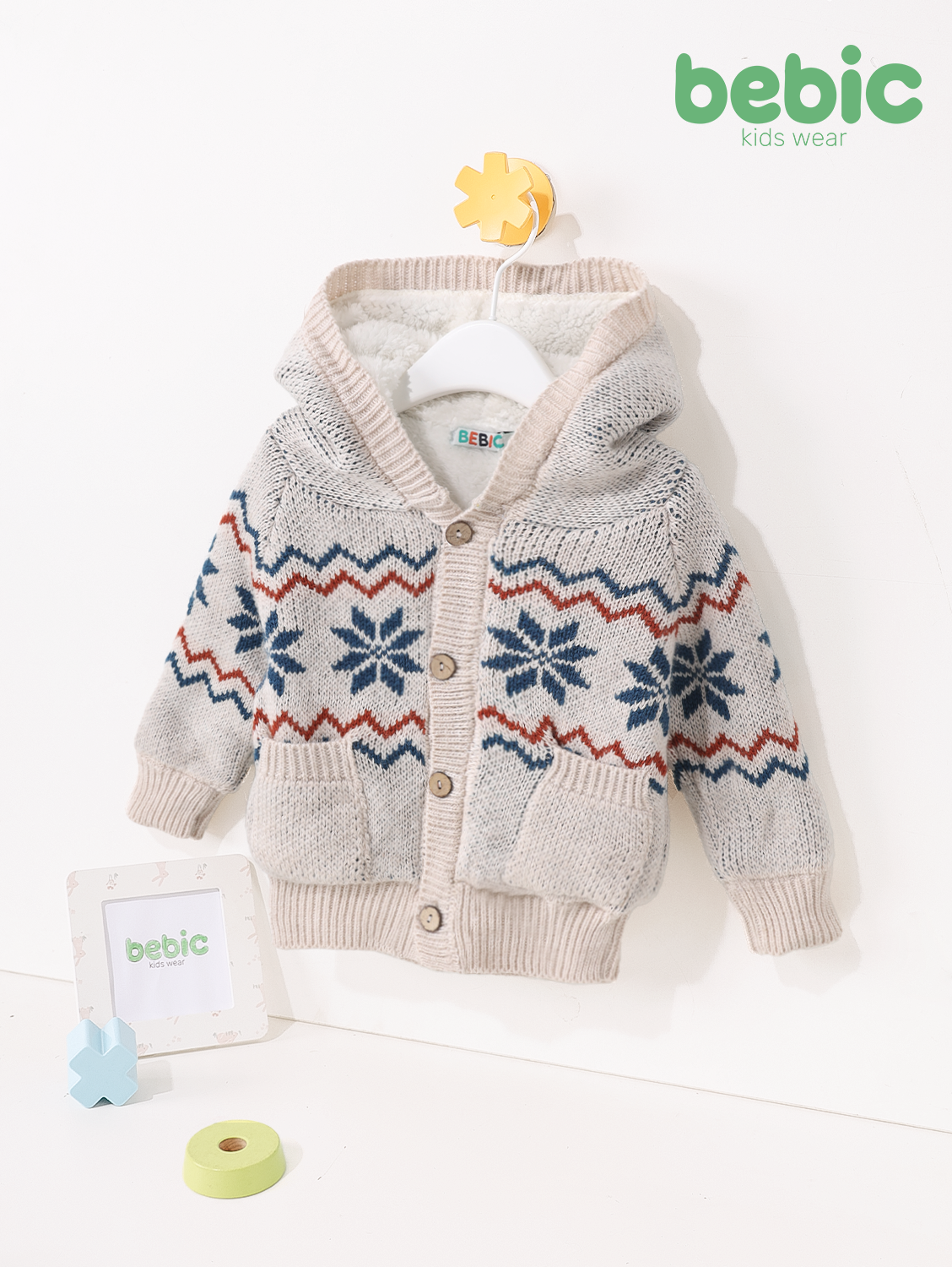 A winter children's cardigan (knit jacket) in light beige or light gray (cream/heather gray). Made from warm, thick knit fabric, it's fully lined with soft white fleece (teddy/sherpa), including the hood, for ultimate warmth. It features the same snowflake and zigzag pattern, but in navy and burnt orange. It has a hood, front pockets, and wooden buttons.
