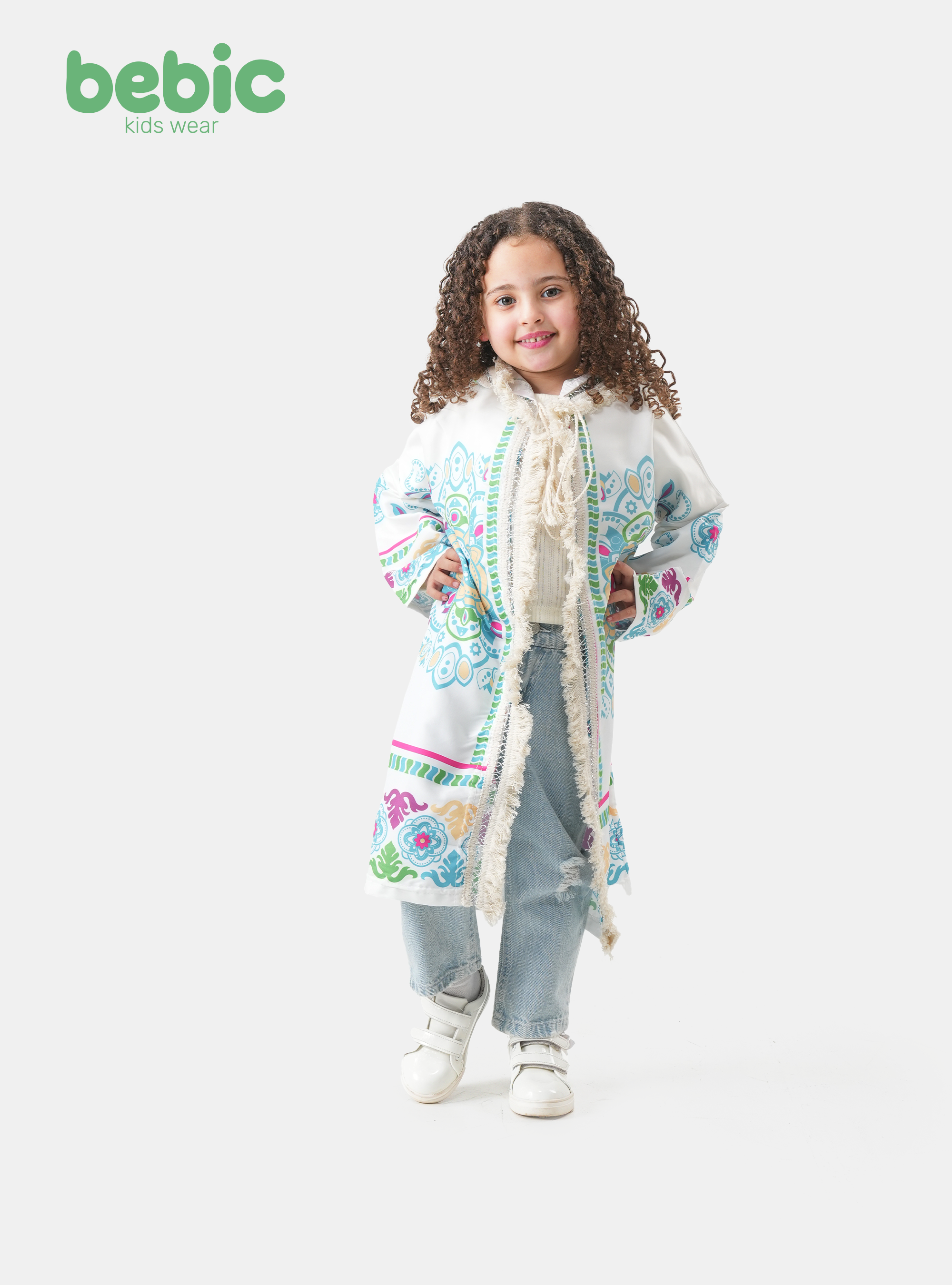 This charming children's kimono from Bebic is the perfect piece to add a touch of joy and modern style to your little girl's summer look. Its relaxed, open design features a hood adorned with soft white tassels for a charming bohemian feel, while vibrant mandala and geometric patterns in royal blue, golden yellow, and fuchsia create a truly eye-catching effect. Made from a lightweight and comfortable fabric, it's ideal as a cover-up for a swimsuit at the beach or as an extra layer over everyday clothes for morning outings, offering a wonderful balance of comfort and beauty that perfectly complements little laughs and adventures in the sun.