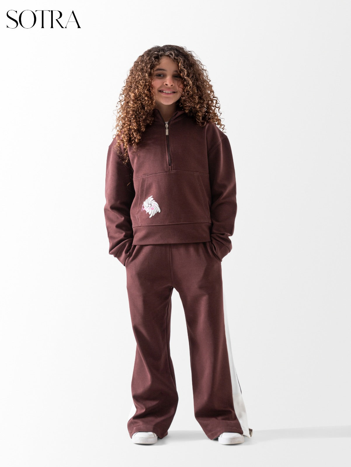 This SOTRA set offers a new definition of athleisure with a striking modern touch. It consists of two harmonious pieces in a rich and warm chocolate brown color. The top is a high-neck sweatshirt with a half-zip, giving a practical and sophisticated look, with a wide front "kangaroo" pocket adorned with a delicate white rose embroidery that adds a soft feminine touch. The look is completed with matching wide-leg joggers that provide superior freedom of movement and feature side details in the form of vertical stripes in bright white, giving the design a classic sporty character and increasing the length of the figure. This makes this set an ideal choice for girls who are looking for everyday comfort without compromising on style and distinction.