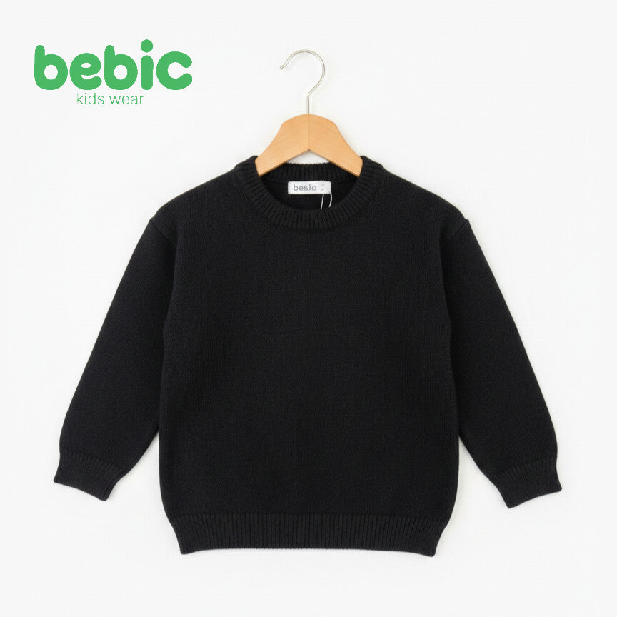 Elevate your child's winter style with this luxurious knit sweater from the Bebic Kids Wear collection, combining classic simplicity with perfect warmth. Featuring a sophisticated black color that's easy to mix and match, this sweater is designed with a ribbed crew neck and elasticated cuffs and waistband for all-day comfort. The soft yet durable knit makes it an essential wardrobe staple, perfect for layering over a collared shirt for formal occasions or for casual everyday wear. This sweater is more than just a garment; it's an investment in quality, giving your child a stylish and warm look that reflects your impeccable taste in children's fashion.