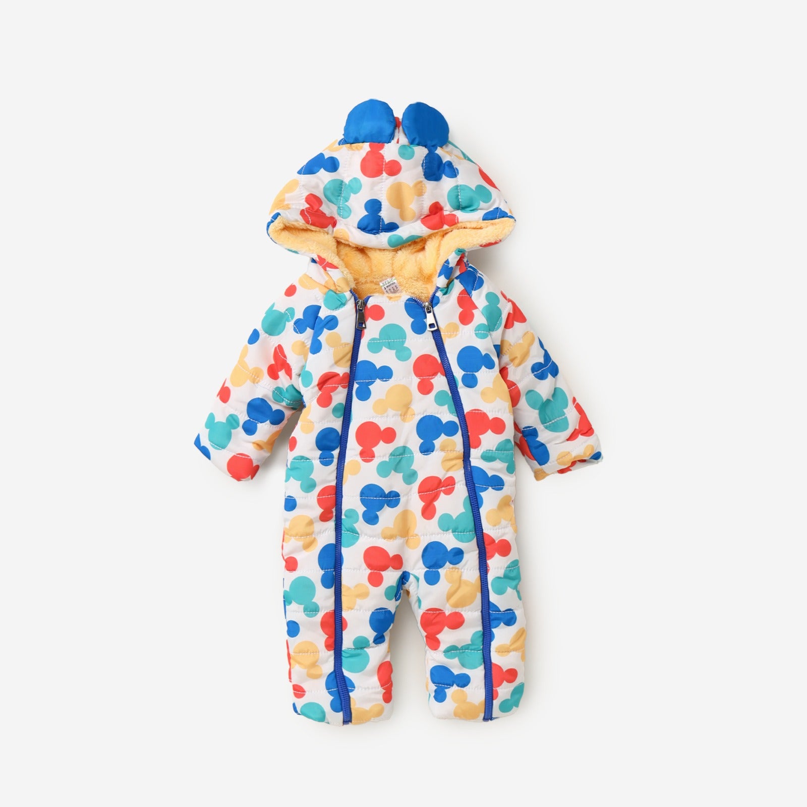 This warm, padded winter jumpsuit features a playful print of Mickey Mouse's circular faces in bright colors (red, blue, yellow, and green) on a white background. The jumpsuit is designed with a thick padded lining for excellent insulation against the cold and is supposedly waterproof. It has a cute hood with prominent blue ears and a warm yellow fleece lining, along with a blue front zipper.