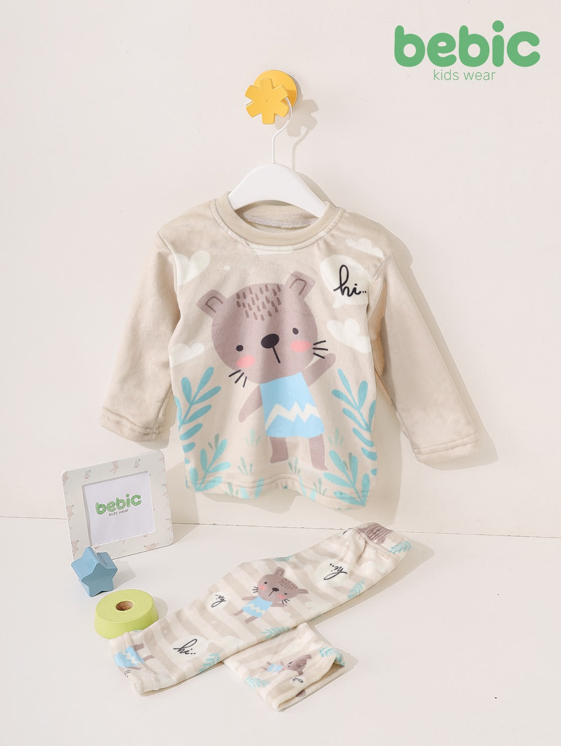 Pants: Matching light beige pants with subtle horizontal stripes. The bottoms feature the same print as the small bear. The pants have elasticated cuffs for a secure fit.