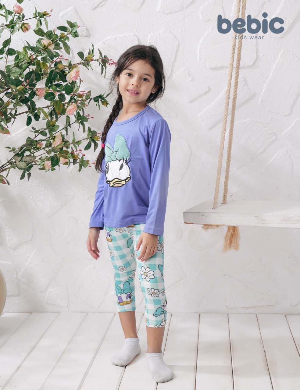 The pajama set consists of a long-sleeved cotton blouse in purple, decorated with a large cartoon print in the center, adding a playful touch suitable for children. The half-length pants feature a light blue and white check design, and are decorated with cheerful cartoon characters and small flowers, giving a cheerful, childlike look. The material is comfortable and lightweight for freedom of movement, suitable for sleeping or relaxing.
