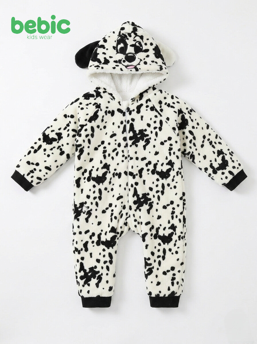 This adorable winter romper for children features a design inspired by the iconic Dalmatian dog in its famous black and white pattern. Made from soft, warm fleece, it provides complete comfort and warmth for your child in cold weather. The romper has a hood shaped like the dog's face with cute floppy ears, creating a fun and charming cartoon look. It has a front zipper for easy dressing and undressing, and closed cuffs to keep little feet warm. This practical and comfortable design is ideal for everyday wear or as a special gift, combining warmth, comfort, and a charming appearance.