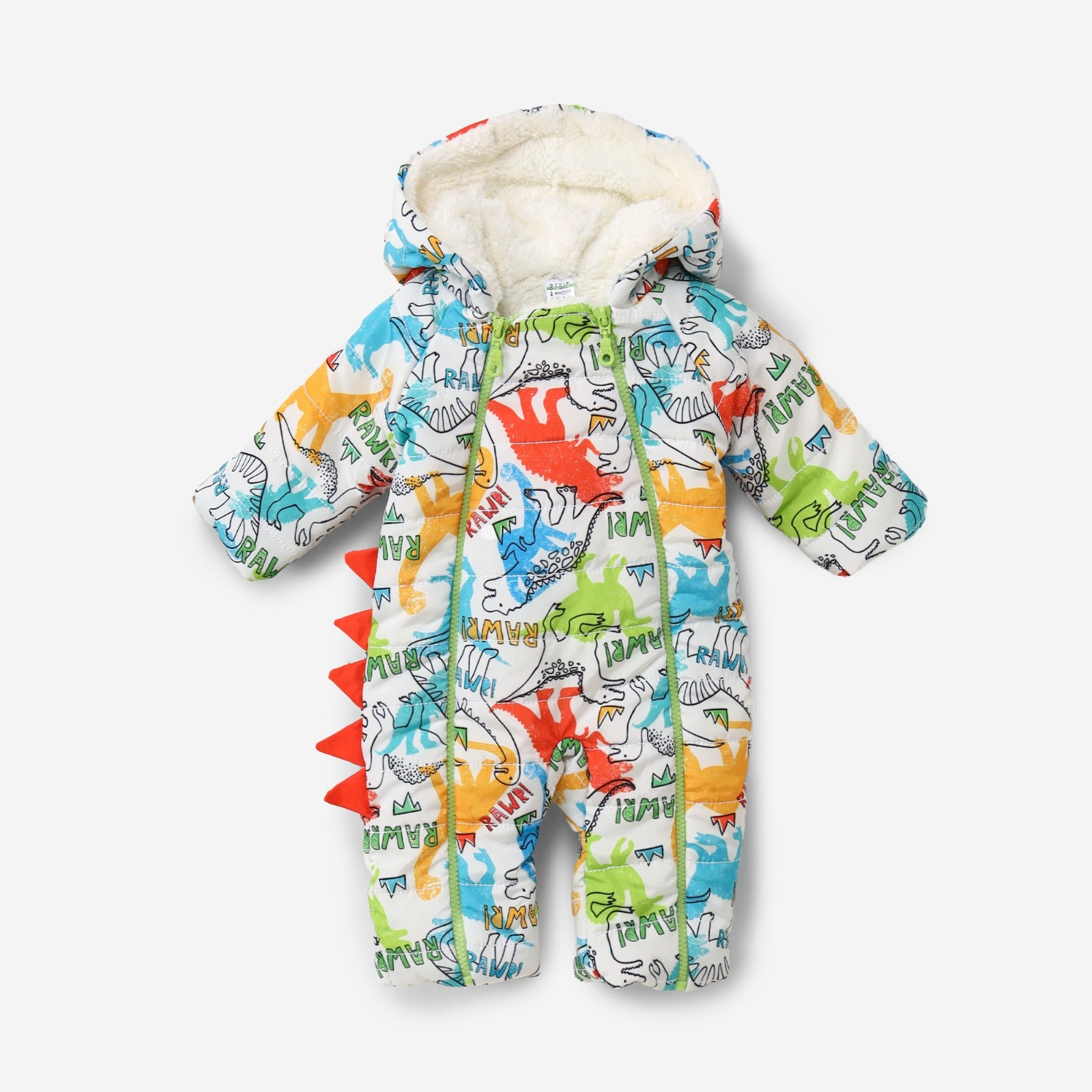Warm winter outfits (snow jumpsuits/overalls) for babies, featuring a fun and adventurous dinosaur design. The base color is white, and it's decorated with a repeating print of colorful dinosaurs (red, green, blue, and orange) with the words "RAWR!" intertwined. The jumpsuit is lined with soft white faux fur at the hood. It features a row of 3D orange/red spikes/spikes running along the back, giving it an attractive, costume-like appearance.