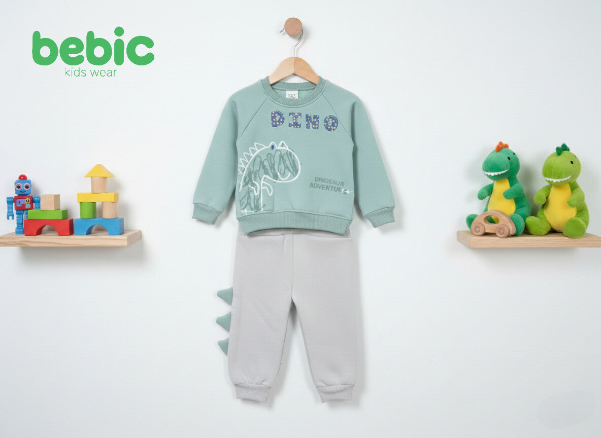 The top comes in a light green (mint) or light brown color, featuring a trendy dinosaur print with the words "DINO" at the top and "DINOSAUR ADVENTURE" at the bottom.