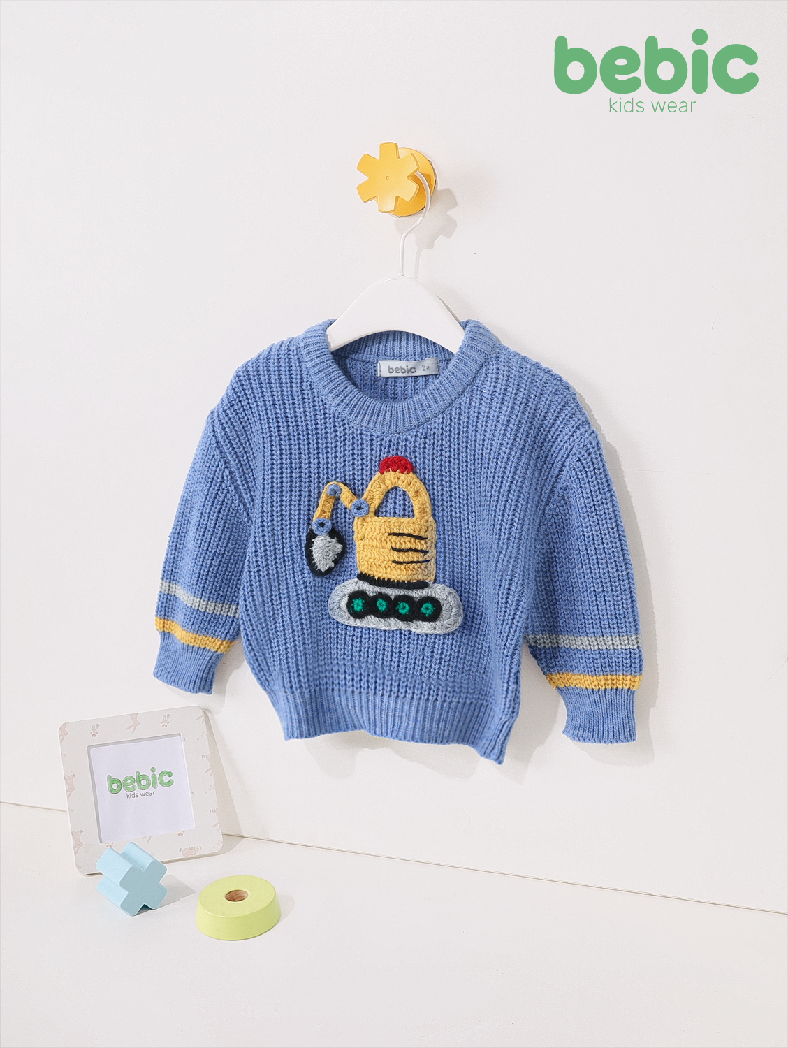 This boys' winter sweater is made from a thick, bright sky-blue knit. It features a warm, ribbed knit and a front embroidered excavator design in yellow and black. The sleeves are finished with thin yellow and gray stripes near the wrist. A fun design perfect for cold weather.