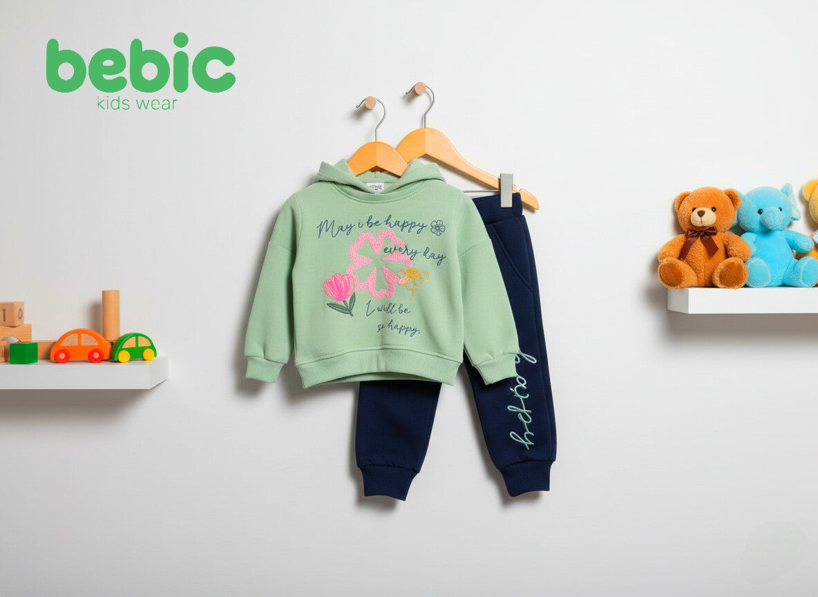 A stylish and comfortable winter set for girls from Bebic Kids Wear. It includes a hoodie and joggers. The hoodie features a central print of a partially embroidered pink flamingo and the inspiring phrase "May I be happy every day, I will be so happy." The matching joggers have the word "happy" embroidered on the leg. With its calming colors and comfortable fit, this set is perfect for everyday wear.