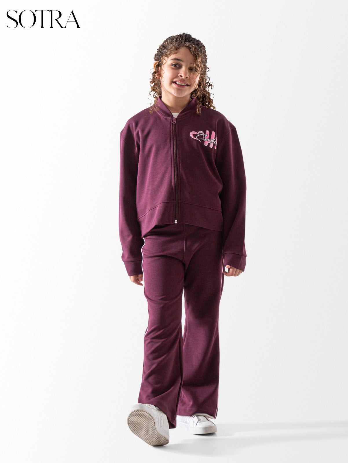 This girls' tracksuit from SOTRA redefines casual style with a modern, feminine touch. It features a full-zip jacket with a short collar, reminiscent of a classic bomber jacket, and delicate embroidery on the chest with the word "Cute" and a pink heart. The pants have a flared leg with colorful side stripes for a sporty yet stylish look. Designed for ultimate comfort during playtime or everyday outings, the flexible fabric allows for freedom of movement while maintaining a polished and organized appearance.
