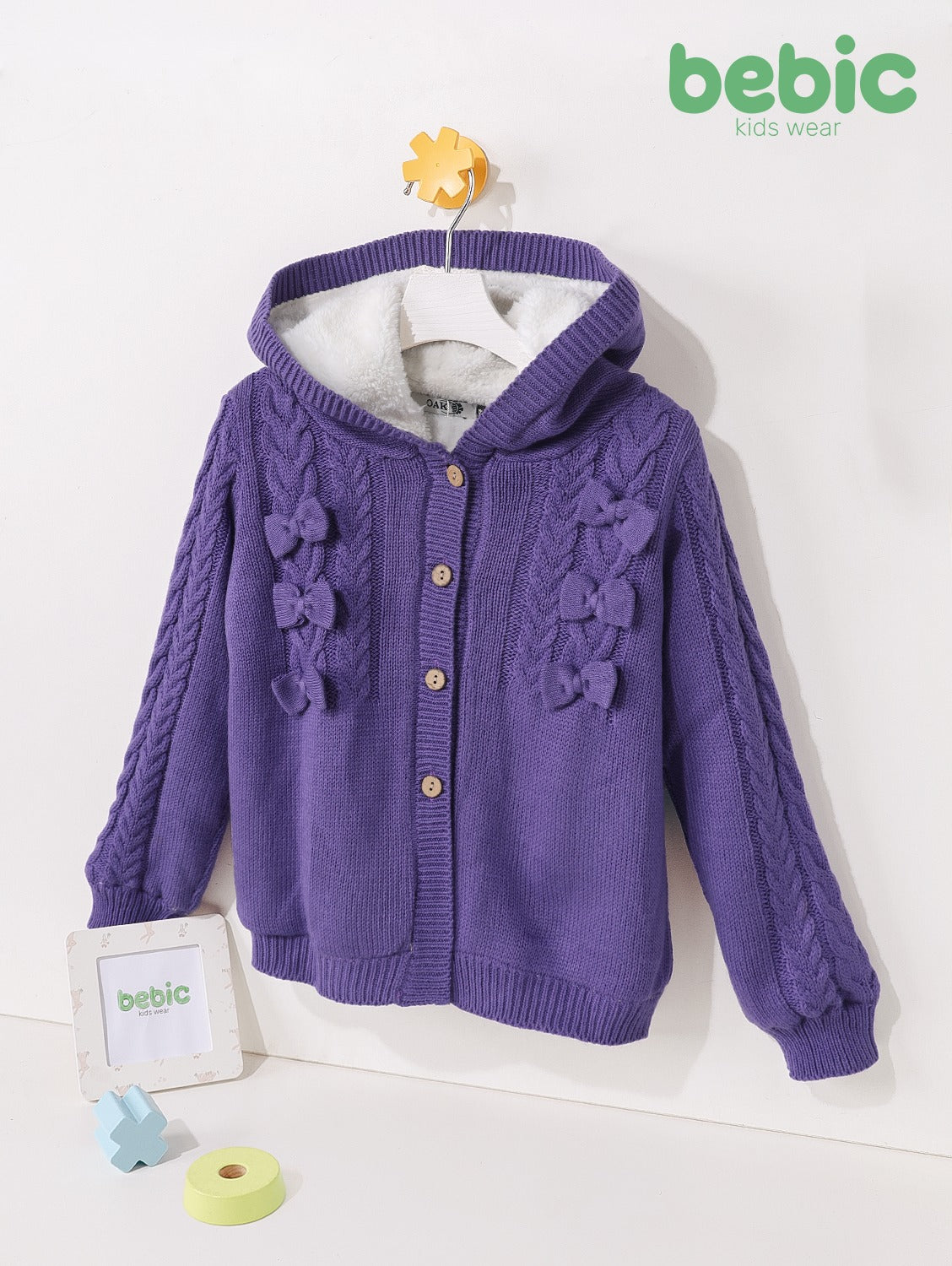 This is a children's winter knit cardigan in a deep purple (lilac) color. The cardigan is fully lined with white fleece or sherpa fleece, making it very warm. It features a padded hood, cable knit sleeves, and decorative bow ties knitted across the chest. It fastens with wooden buttons at the front.