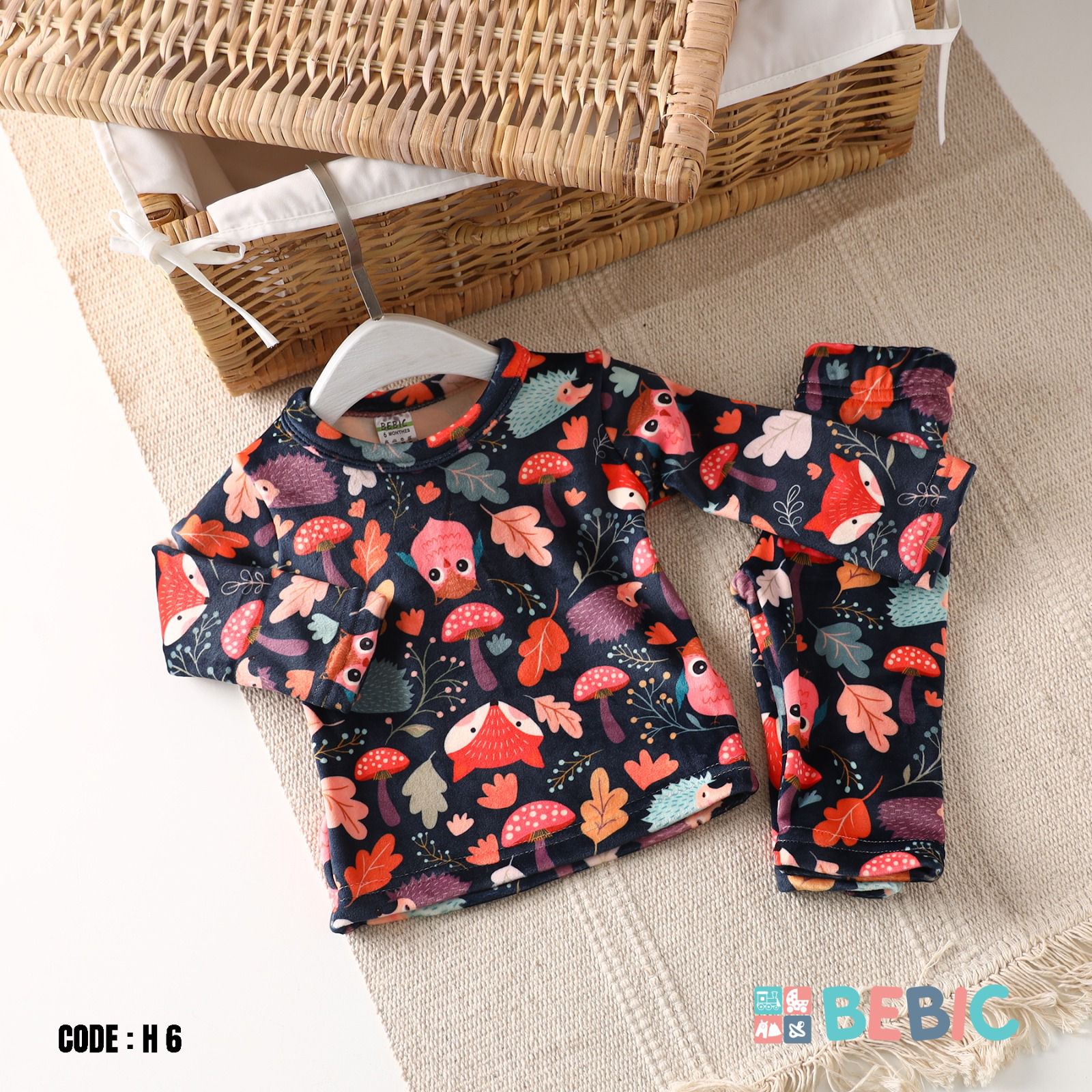 Give your child a fun and cozy look with this delightful winter set, designed with rich prints inspired by the enchanting forest friends. The set features a dark background that clearly showcases red foxes, colorful hedgehogs, and tiny mushrooms, along with falling leaves in a wonderful color harmony that brings winter wear to life. The two-piece set (sweatshirt and pants) has the same all-over print for a coordinated and stylish look, and is made from a soft winter fabric that provides excellent warmth for your child's skin. The sweatshirt has a flexible crew neck for easy dressing, while the pants have an elastic waistband and cuffs to ensure a secure fit and freedom of movement all day long.