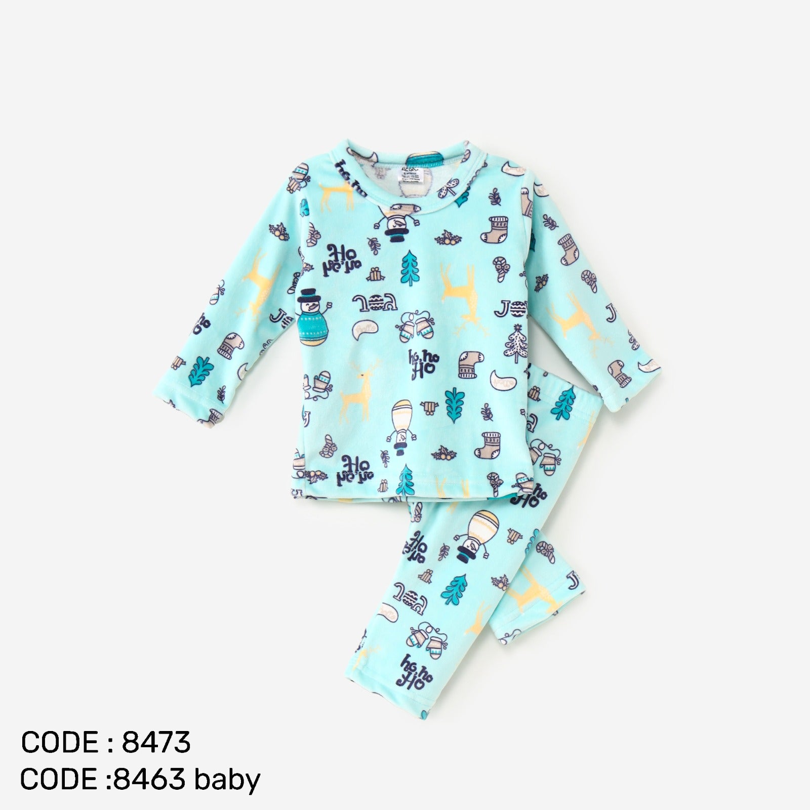 Description: This two-piece winter pajama set for children is made of soft fleece and comes in a cheerful light turquoise color. It features playful winter prints including a snowman, reindeer, and Christmas stockings with the phrase "Ho Ho Ho." The design is practical and comfortable, with a round neck and long sleeves to provide optimal warmth for your child in cold weather.