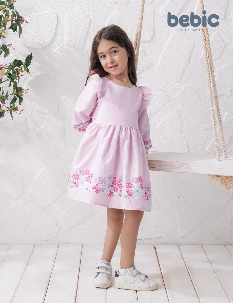 This light pink (lilac) fall dress from Bebic Kids Wear is simple and elegant. The dress is almost solid in color with subtle snowflake star patterns. The bottom is decorated with a wide band of pink and light blue snowflake floral print, giving a "Frozen" feel. The dress has three-quarter sleeves with ruffles at the shoulders and decorative details at the cuffs. The little girl wears it with comfortable white sneakers.