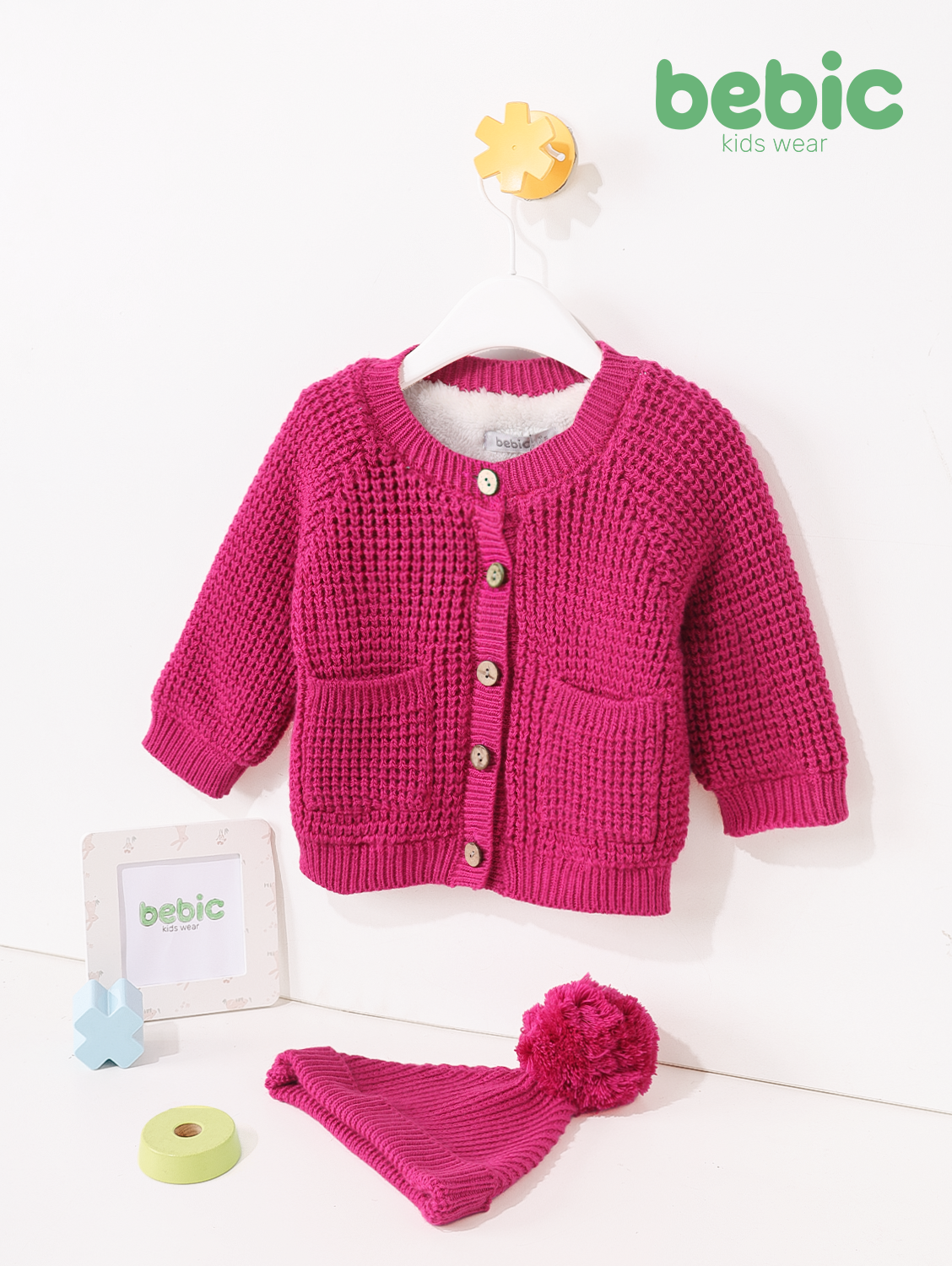 Attached Hood: A matching knit hood, complete with a pom-pom, is shown in the image and is designed to be worn with the cardigan.