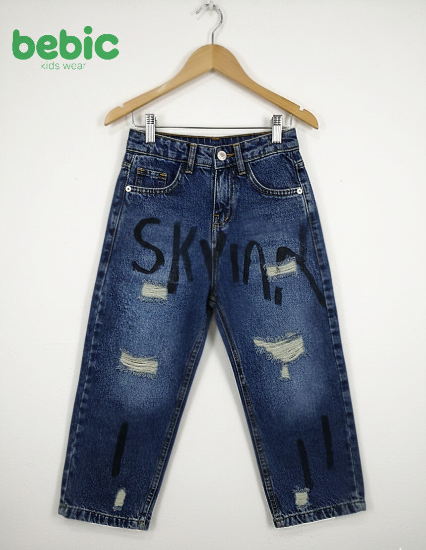Unleash your child's adventurous spirit with these trendy bebic jeans, combining artistic boldness with everyday comfort. Featuring a relaxed wide-leg cut for complete freedom of movement, these jeans are crafted from high-quality denim that can withstand frequent wear. What truly sets them apart are the carefully placed distressed details and unique, hand-drawn black graffiti, giving them a distinctly streetwear feel. Available in two key washes—light sky blue and rich medium blue—these jeans are a must-have statement piece for any child who wants to stand out.