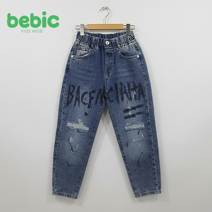 Bebic Kids Wear offers a must-have for your child's stylish wardrobe: a pair of jeans that combine boldness and comfort in a wide-leg baggy style that's on trend. Made from durable yet flexible denim, these jeans ensure your child's comfort during movement and play. They feature creative artistic touches, including hand-drawn graffiti prints and paint splatter effects, giving them a vibrant and unique look. The jeans also feature carefully distressed ripped details with a lining and a flexible elastic waistband with top pleats for a secure, comfortable fit. Available in classic and attractive colors such as light blue, medium blue, and washed black, these jeans are the perfect piece to complete any casual look.