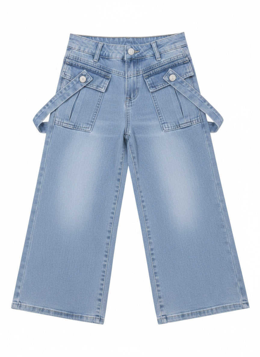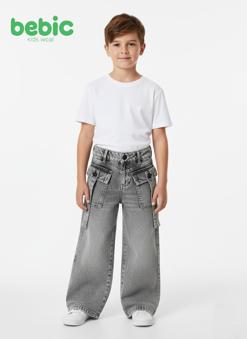 Description: These bebic pants feature a bold, modern design that combines luxury and practicality. They come in a luxurious acid wash gray denim fabric that gives them a vintage and elegant look at the same time. The pants are unique in their extra wide-leg cut that keeps up with the latest global fashion trends. They also feature huge, unconventional front pockets with extra fabric ends dangling from them, equipped with prominent black buttons that add a touch of rebellion and geometric elegance. With a high, tight waist that ensures complete comfort for the child, this piece is an exceptional choice to create a unique urban look that attracts attention on all occasions.