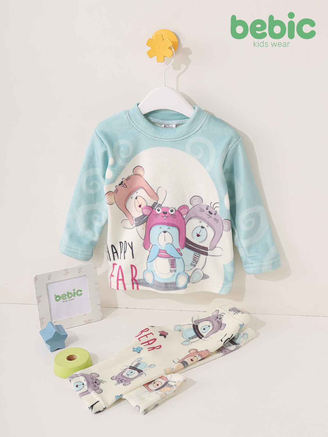 Enjoy warm and cozy nights in this cute winter pajama set. The shirt features a calming light blue color and a playful central print of three bears wearing winter hats, along with the phrase "HAPPY BEAR."The pants are a light beige/beige shade and feature a repeating teddy bear print, creating a coordinated look. The two-piece set features long sleeves and legs and is made of soft and warm velvet, perfect for cozying up and a restful night's sleep.