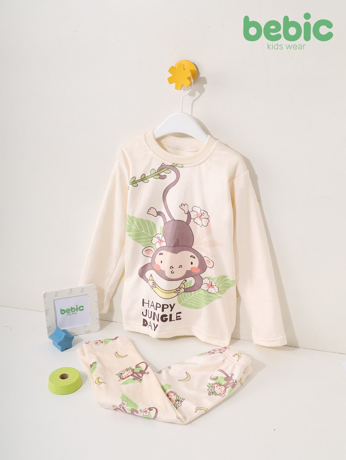 This padded winter lounge/pajama set is made of soft, warm fabric. The white/cream top features a large print of a cute monkey swinging among leaves, along with the phrase "Happy Jungle Day." The light-colored pants are decorated with repeating banana and monkey prints.