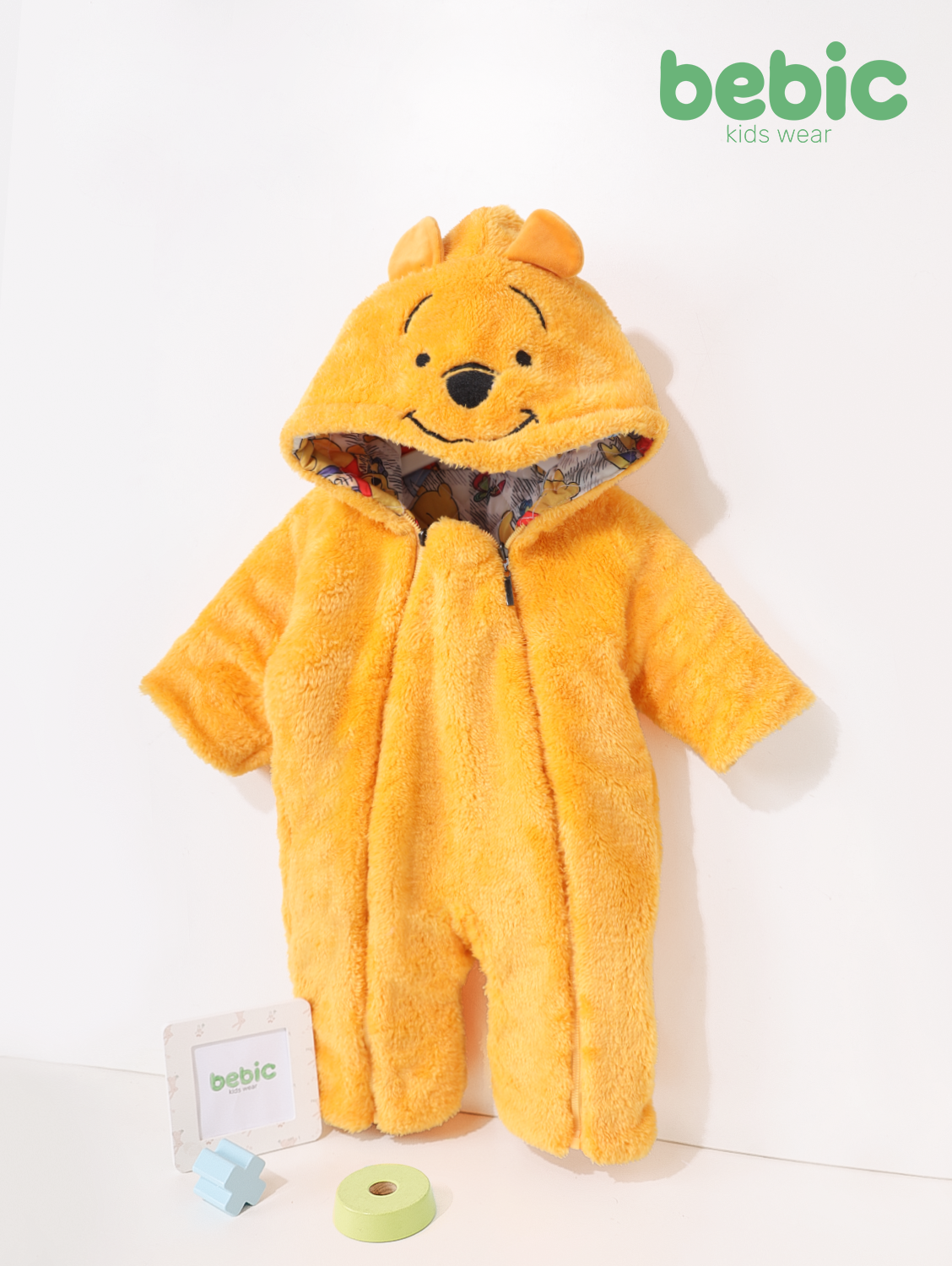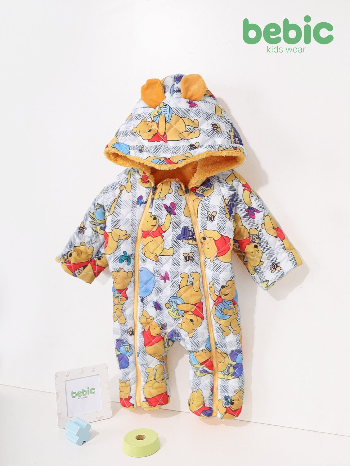 This puffer snowsuit features a white background with thin gray "hand-drawn" stripes and colorful Winnie the Pooh prints with butterflies and bees. It's designed with diamond quilting for even lining and optimal warmth, and has double yellow zippers for easy on and off. The hood is lined with soft yellow sherpa and has cute pop-out ears, while the fully enclosed legs keep your child warm.