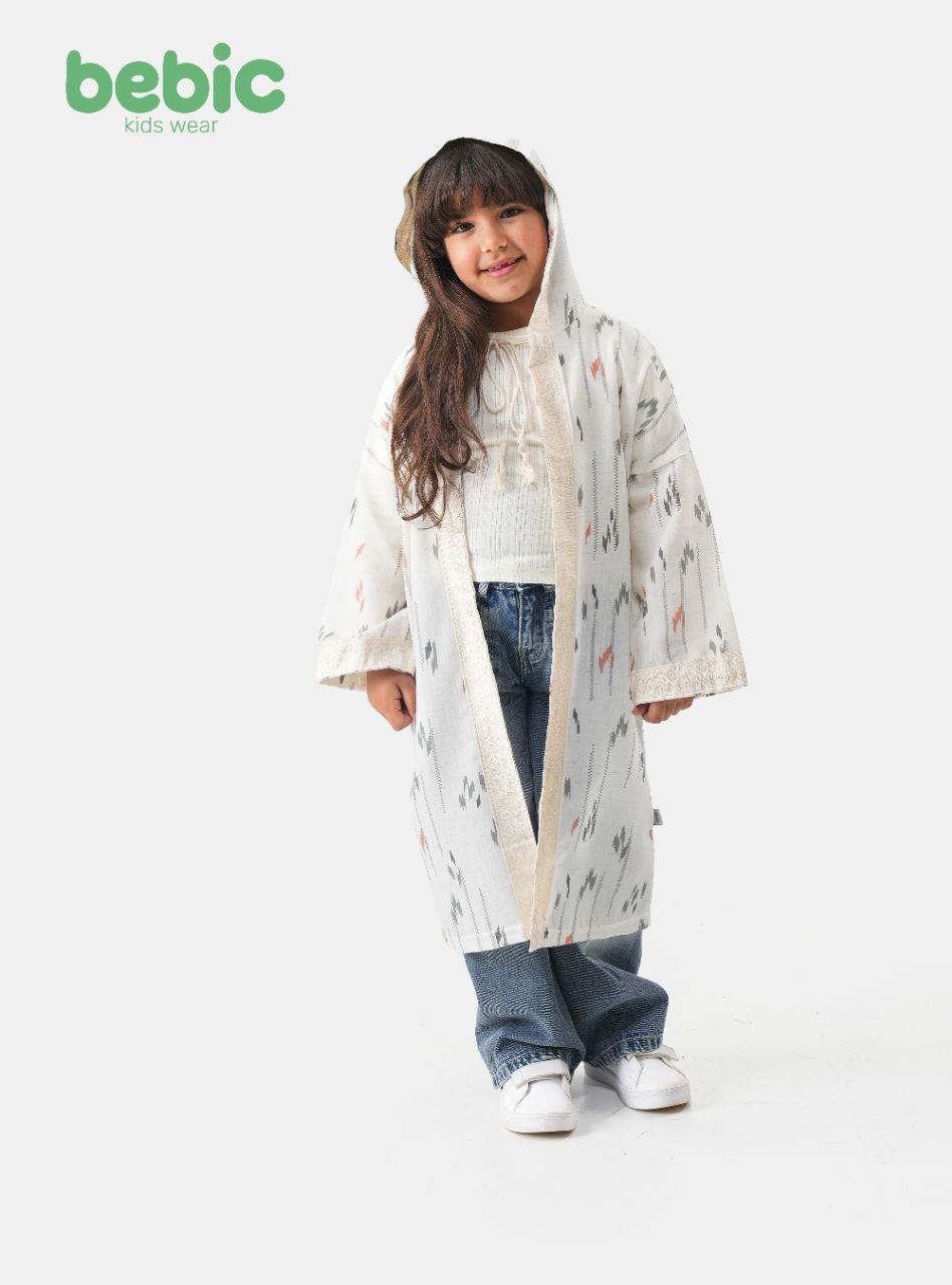 Bebic's grey and white collection features pieces that combine sophisticated modesty with a modern spirit, with the long cardigan (in the style of a bisht) standing out as a key piece for special occasions. The design is available in two fabric options: a solid grey with a subtle sheen, and a white adorned with delicate geometric Ikat patterns in shades of grey and muted orange. Both models are embellished with rich, luxurious gold embroidery that extends along the entire hem and sleeves, and a hoodie adds a touch of practical childlike charm. Designed with a relaxed, flowing silhouette and kimono-style sleeves, these pieces give your child a regal and elegant look, perfect for layering over casual outfits to instantly add a touch of modern sophistication to traditional holidays and celebrations.