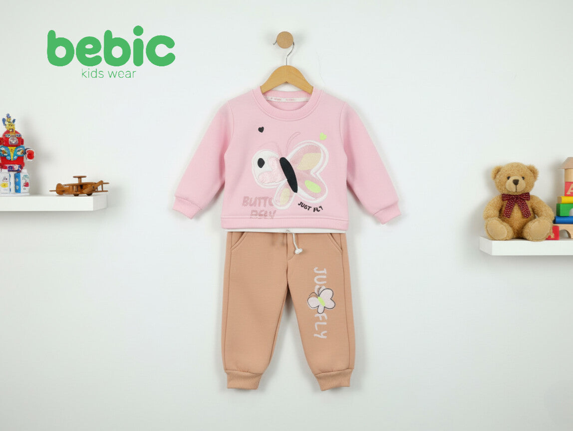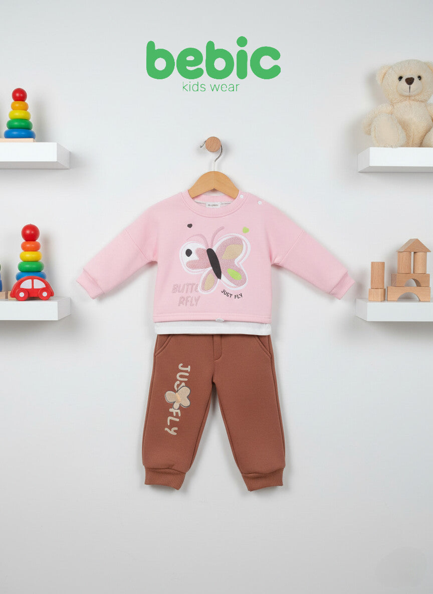 This children's set consists of a sweatshirt and pants made of warm and comfortable twill. The sweatshirt features an eye-catching butterfly graphic and the word "JUST FLY" for a playful touch. Available in two designs in muted, tonal colors—caramel with brown and pink with purple—for a warm and soft look.