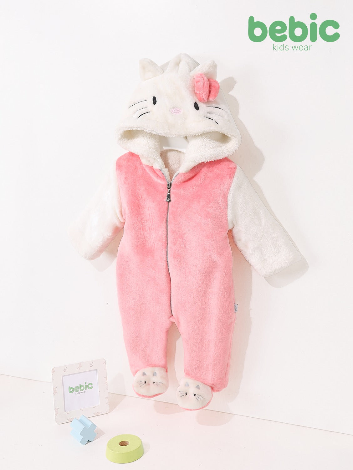 "A winter jumpsuit for babies made of soft fleece in an attractive pink color for the legs and body, with bright white sleeves and a hood. The design features a hood that mimics the face of the character 'Hello Kitty' with embroidered eyes, whiskers and a prominent pink bow. The jumpsuit is fully lined with white sherpa fleece to ensure maximum warmth. The piece has a long front zipper, and ends with closed feet designed in the shape of a small cat's face to complete the cute look."