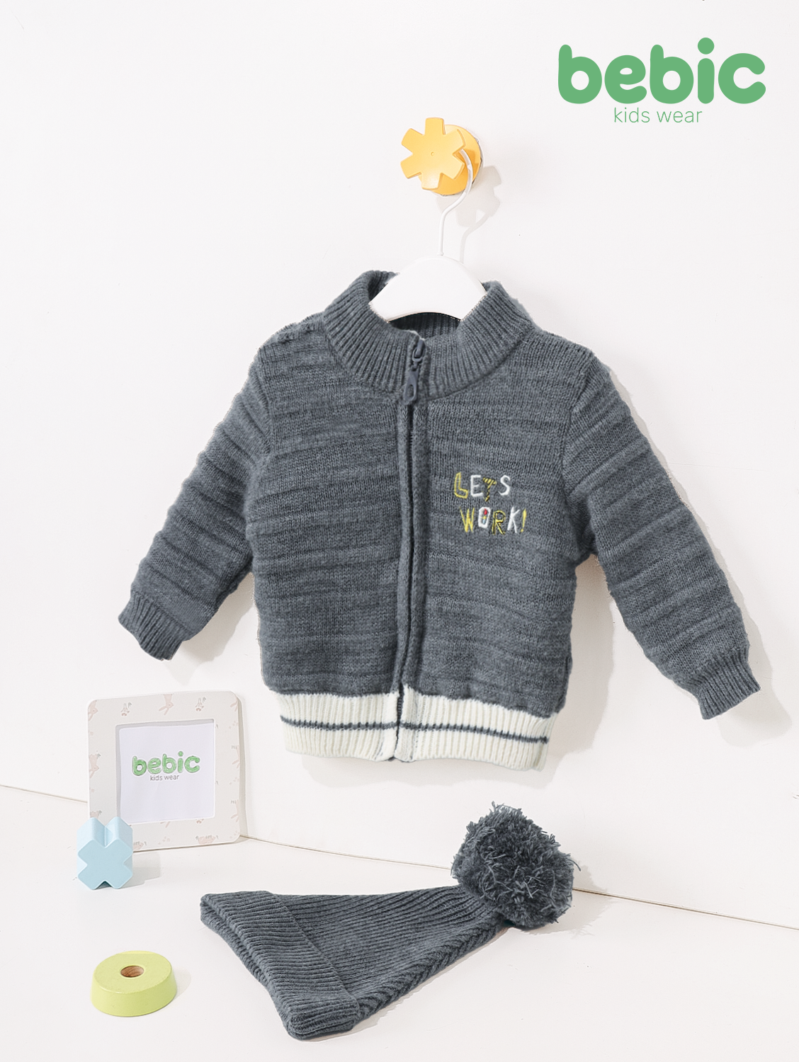 A children's winter jacket (zip-up cardigan) in dark gray (charcoal). Made from chunky knit fabric with a horizontally raised stitch, it features a high neck and a full front zip. The jacket is adorned with a simple yet inspiring embroidered "LET'S WORK!" message on the chest in yellow and green. It has narrow, two-tone trim (black and white/dark gray). Shown here with a matching wool hat and pom-pom.