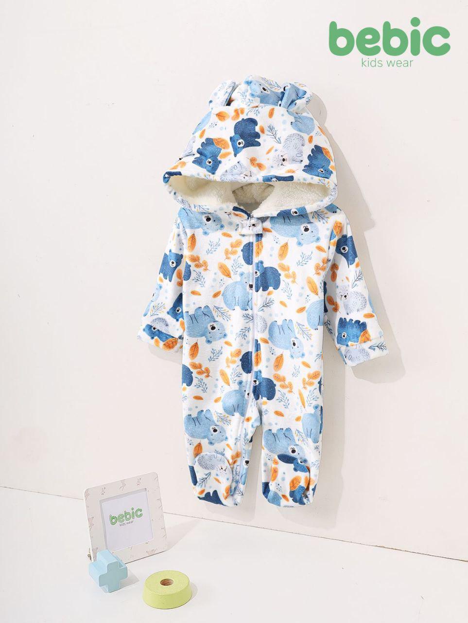 This fully fleece-lined winter romper for babies provides excellent warmth. The base color is white/off-white, with an adorable print of blue bears and scattered orange leaves. It features a hood with tiny protruding ears and a soft white/cream faux-fur lining. It closes with a full front zipper, perfect for keeping little ones cozy.