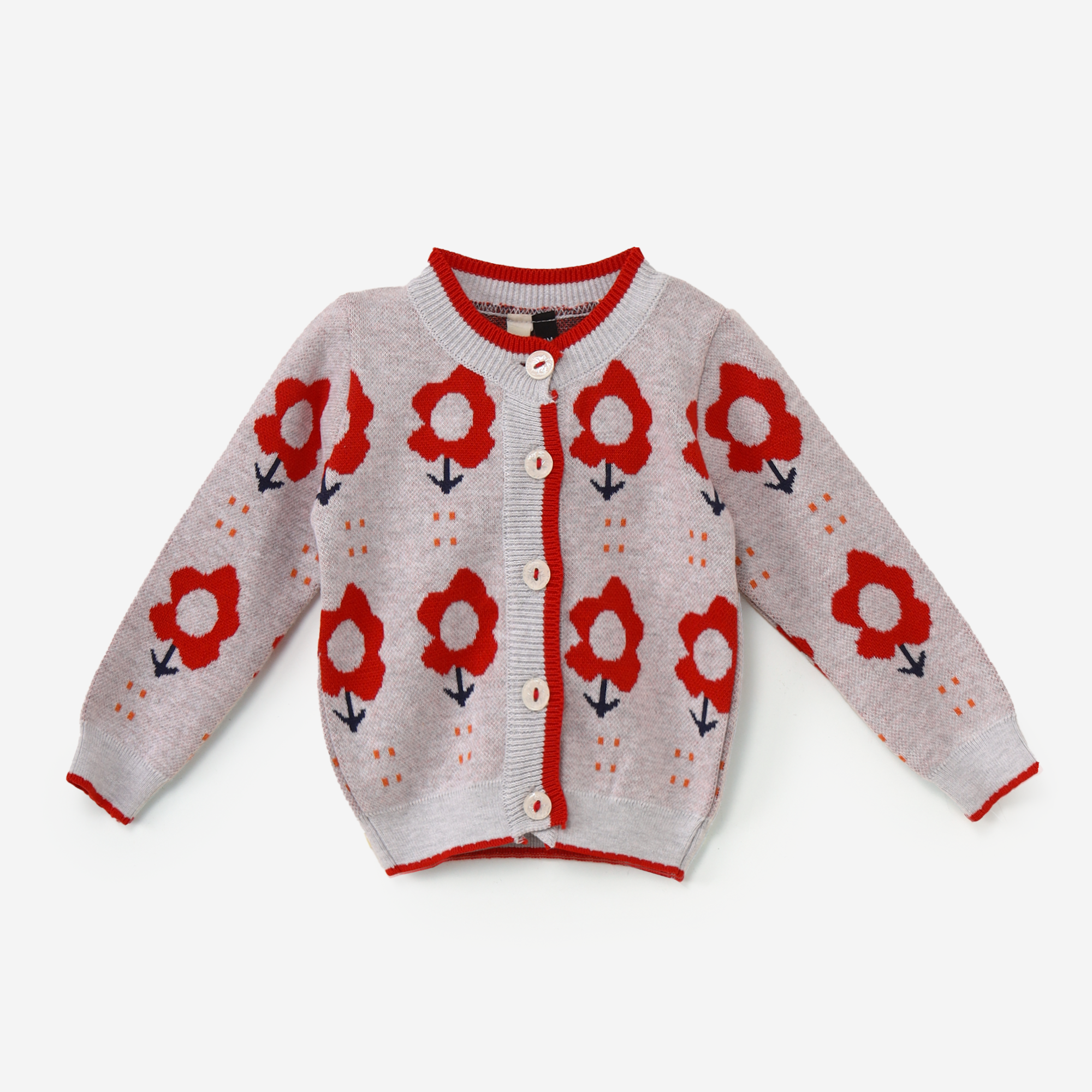 Light gray baby knit jacket with a bright red floral pattern. It features rounded white buttons and a red border around the neck, buttons, sleeve cuffs, and bottom. Suitable for unisex from newborn to 3 years. A warm and cheerful design for a cute look.