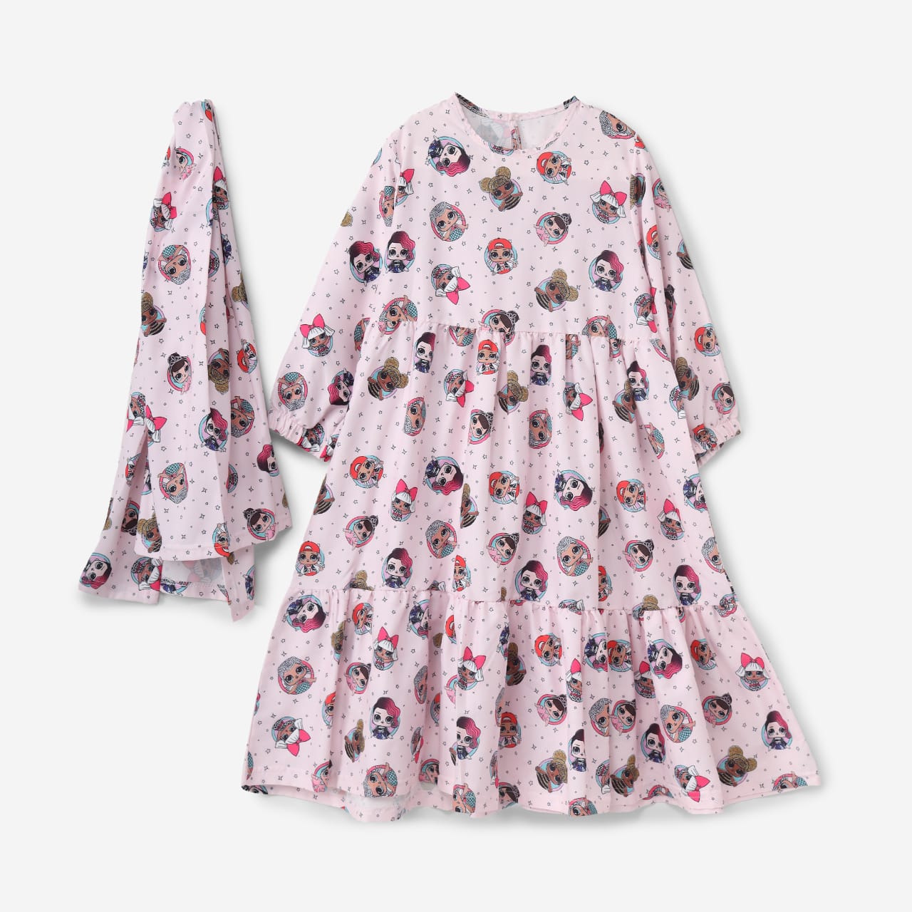 This delicate pink dress combines modern elegance with the playful spirit girls adore. Its comfortable maxi design features multiple tiers for a flowing and dynamic silhouette. The fabric is adorned with an all-over print of the beloved "LOL Surprise" characters in delightful artistic touches, and it boasts long sleeves with delicate elasticated cuffs and a classic round neckline. What truly sets this piece apart is its perfect matching as a complete outfit. The dress comes with a matching headscarf (hijab) in the same print and color, making it an ideal choice for family gatherings or holidays. It offers a touch of modesty combined with captivating childlike beauty, highlighting your little girl's playful personality.