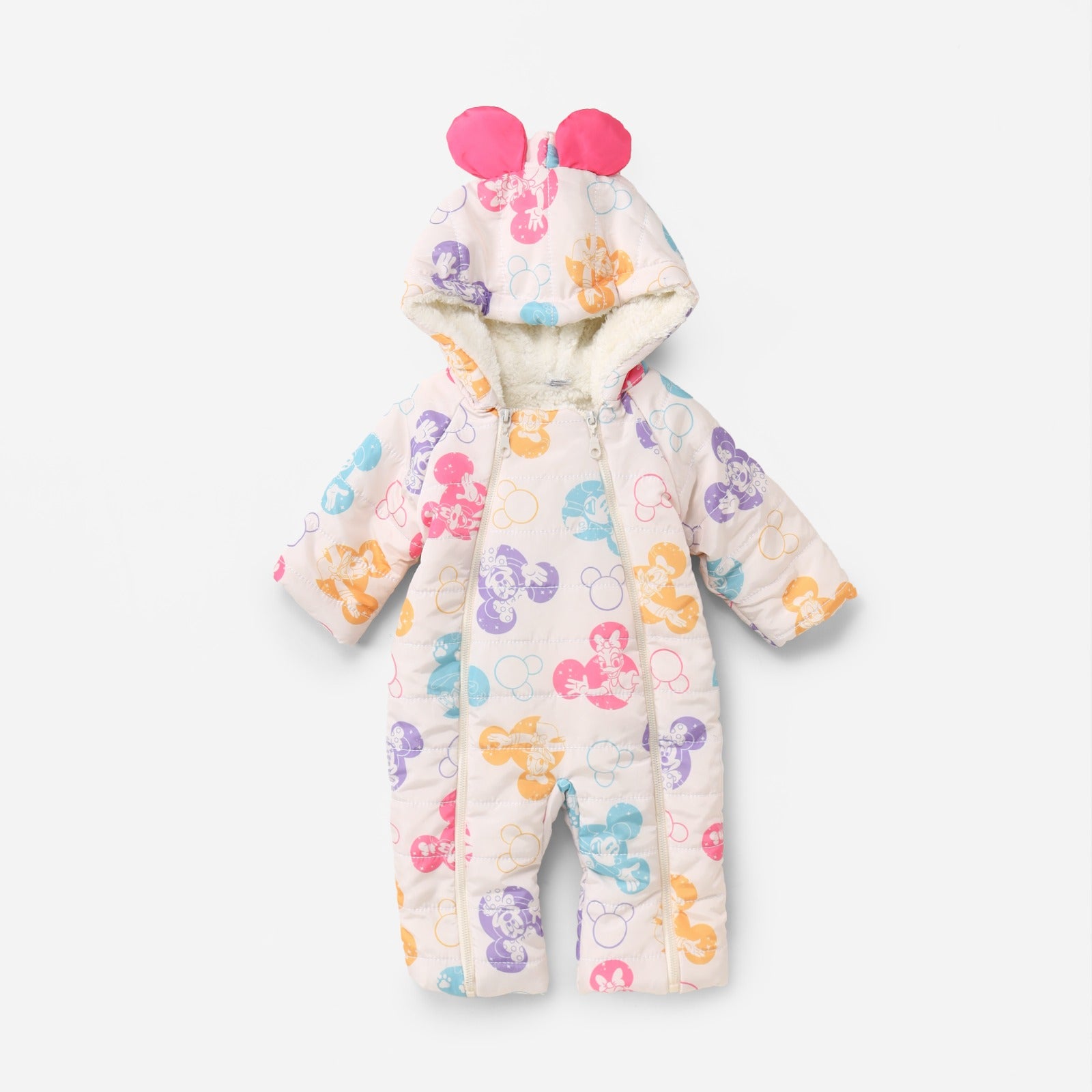 Warm winter outfit (snow jumpsuit/overall) for babies, featuring the popular Minnie Mouse character. The jumpsuit is fully lined with soft white fleece for extra warmth. The base color is off-white/pale pink, adorned with a colorful repeating print of Minnie Mouse's face (in shades of purple, blue, orange, and pink). It features a hood with Minnie Mouse's prominent dark pink ears. It has a full front zipper for easy dressing.