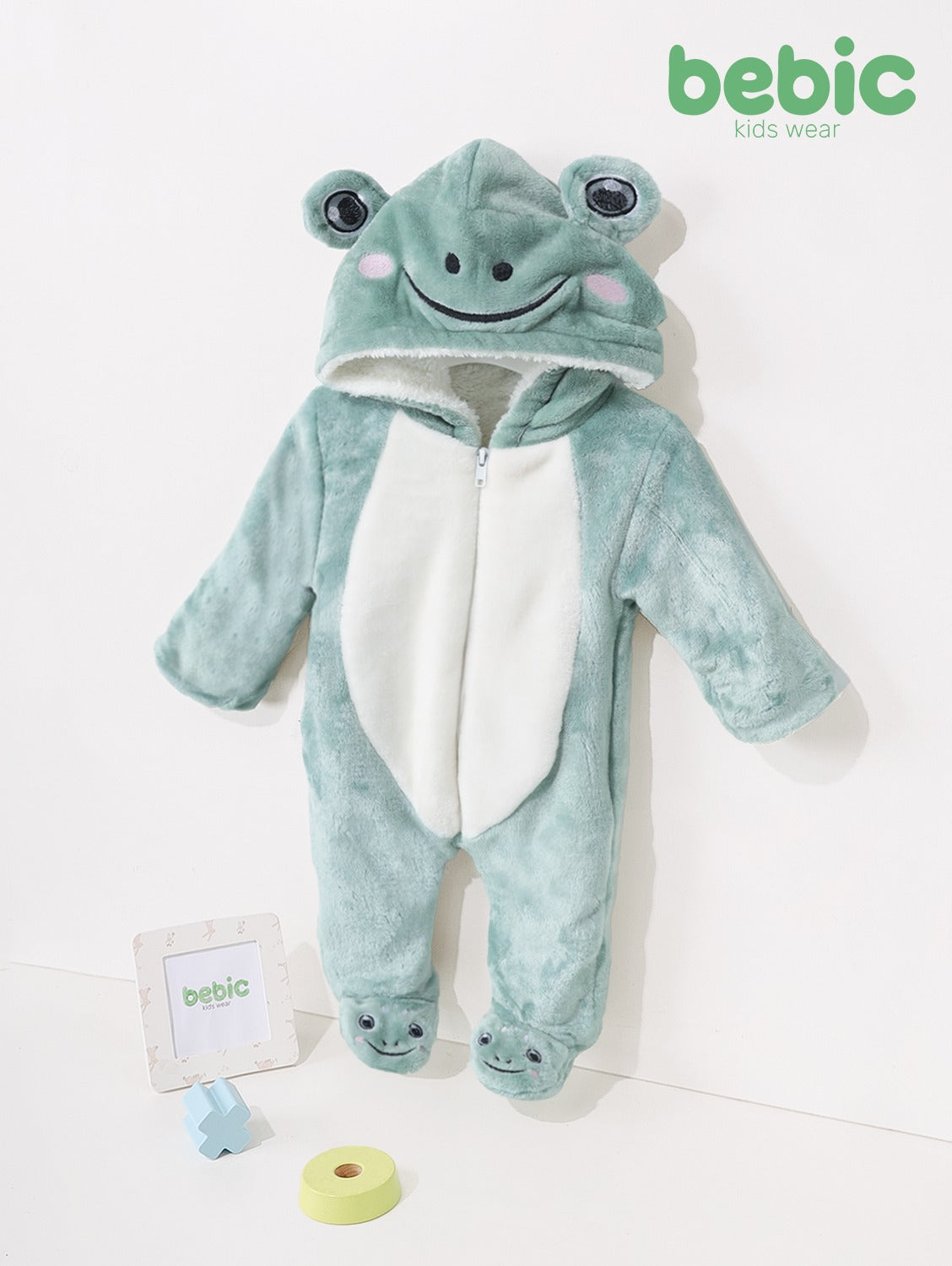 This children's winter romper is a warm and cozy piece made from thick fleece in a soothing light green/mint color. It features a cute frog costume design with a white chest area resembling a frog's belly. The highlight is the attached hood, which forms a smiling frog face with large, prominent eyes on top and embroidered pink cheeks. The hood is lined with soft white fleece and fastens with a front zipper. The sleeves and legs are long and have closed feet, and the smiling frog faces are also embroidered on the feet.