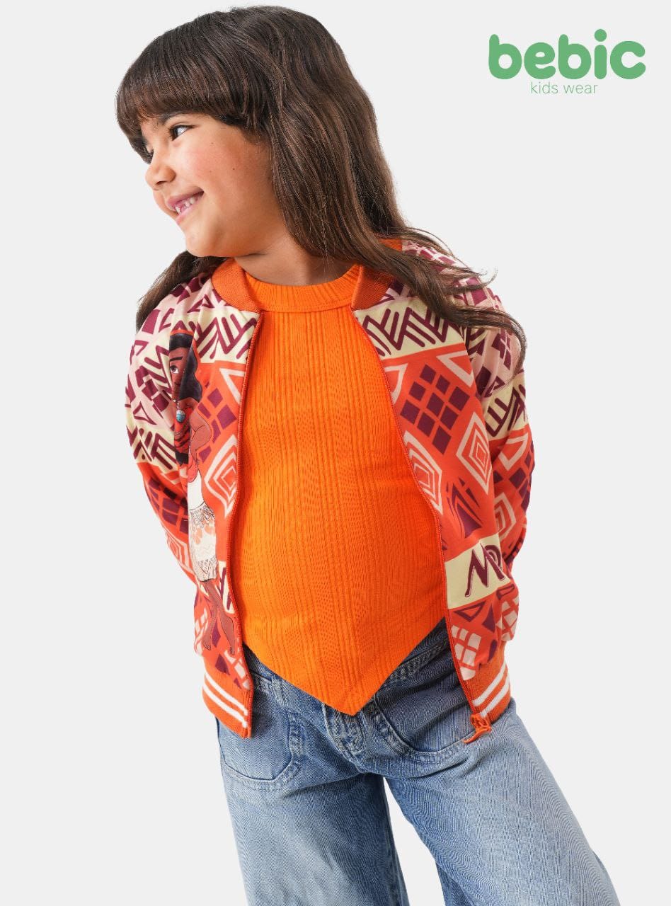 Unleash your little girl's adventurous spirit with the Moana tropical jacket from Bebic Kids Wear, combining warmth with a stylish and eye-catching design. Featuring a geometric pattern inspired by tribal heritage in warm orange and red hues, the jacket is adorned with the beloved Moana character, adding a touch of vibrancy and boldness to her everyday look. Designed with a comfortable bomber fit and striped elasticated cuffs for a secure fit and protection from chilly breezes, this jacket is the perfect choice for school trips or family outings. Pair it with blue jeans and an orange t-shirt for a harmonious look that reflects your child's bright energy in a style that blends imagination and elegance.