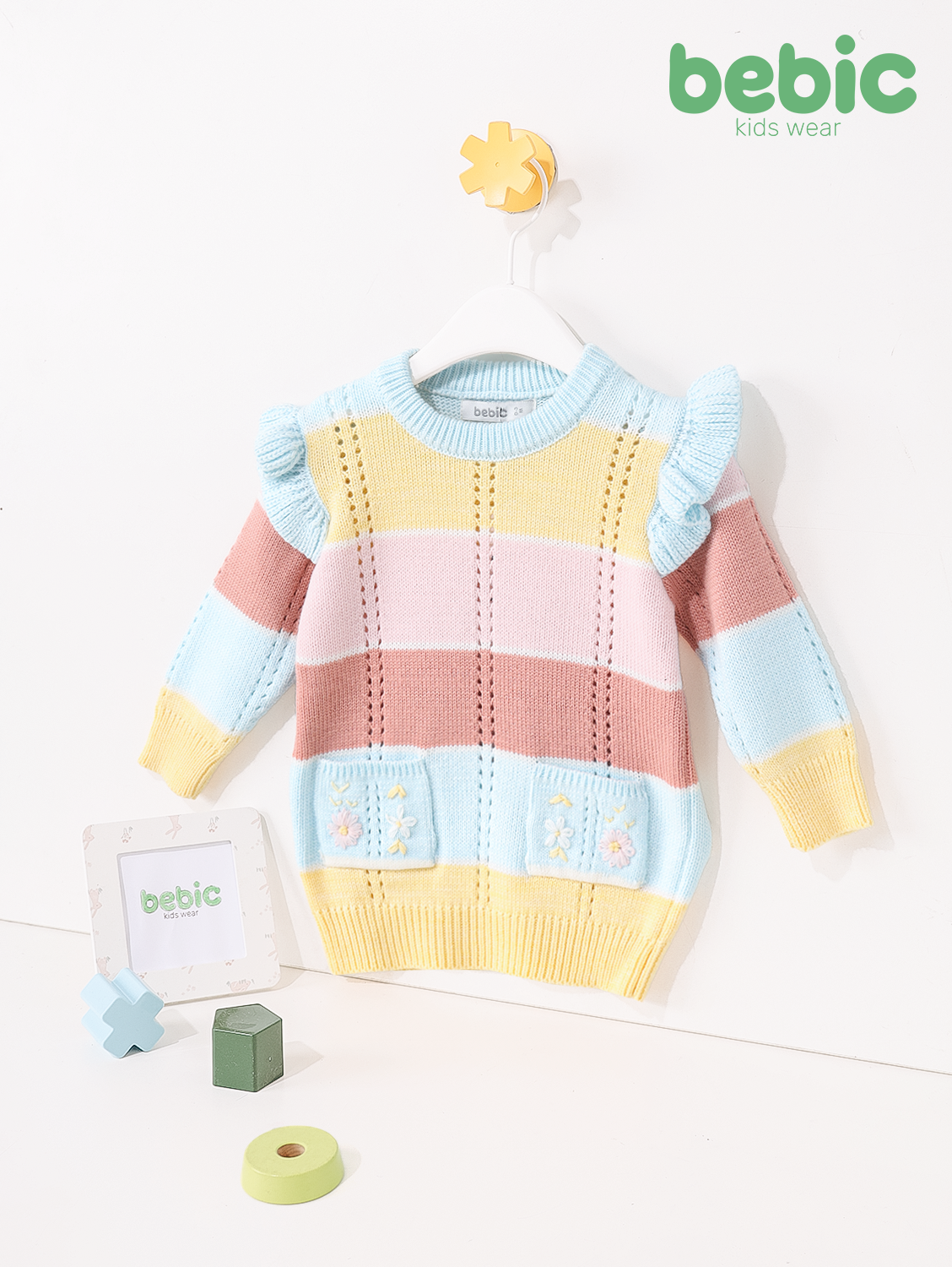 This girls' pullover is made from lightweight knit fabric in cheerful pastel stripes: pale yellow, light pink, and dusty rose. It features elegant light blue frill detailing at the shoulders. The pullover has two small pockets at the hem, adorned with delicate floral embroidery. A perfect design for a cozy and comfortable spring and autumn day.