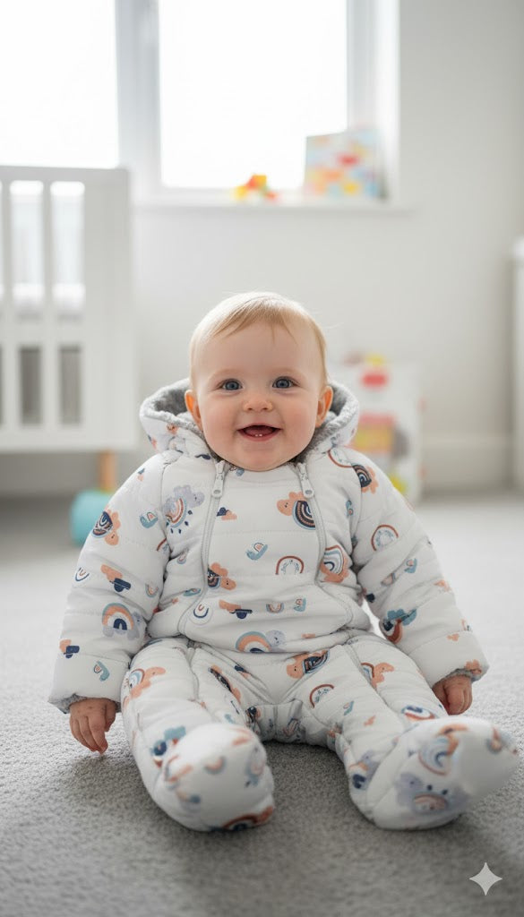 Warm winter outfit (snow jumpsuit/overall) for babies, with a cute and cozy design. The base color is white/off-white, covered with a delicate, repeating print of rainbows and clouds in soft earthy tones (pale blue and orange-pink). The jumpsuit is lined and warm, and features a gray fleece-lined hood with a trim. It has closed feet for extra warmth and fastens with two slanted white zippers for easy on and off.