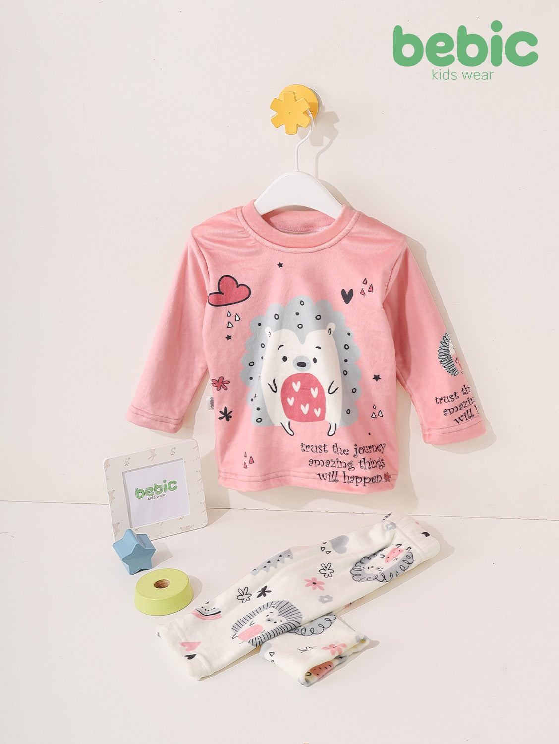 A girls' set consisting of a long-sleeved T-shirt and leggings. The T-shirt is a soft pink color, featuring a large, cheerful hedgehog print and a positive message in English. The leggings are white and feature a repeating hedgehog print. The fabric is soft (possibly light velvet or cotton) and unlined, making it suitable for everyday wear in milder seasons.