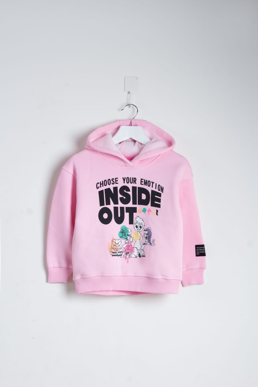 Description: This pink hoodie from the winter collection combines warmth and fun. Made from heavy fabric and lined with a soft layer, it provides maximum comfort for the child in cold weather. It features a modern design that includes an attached hood (Zabuton) and elastic edges at the sleeves and waist to ensure a snug fit. It is also adorned with a vibrant print of characters from the famous Disney movie "Inside Out" with the inspiring phrase "CHOOSE YOUR EMOTION INSIDE OUT," making it a perfect piece to give your child a cheerful and modern look suitable for daily outings and school activities.